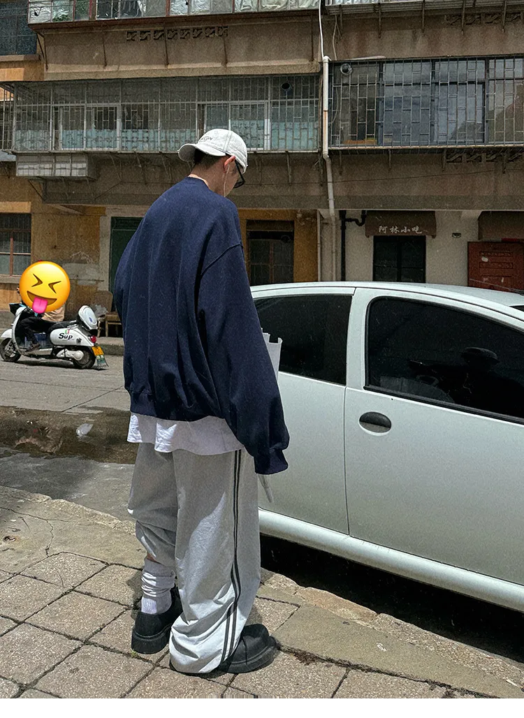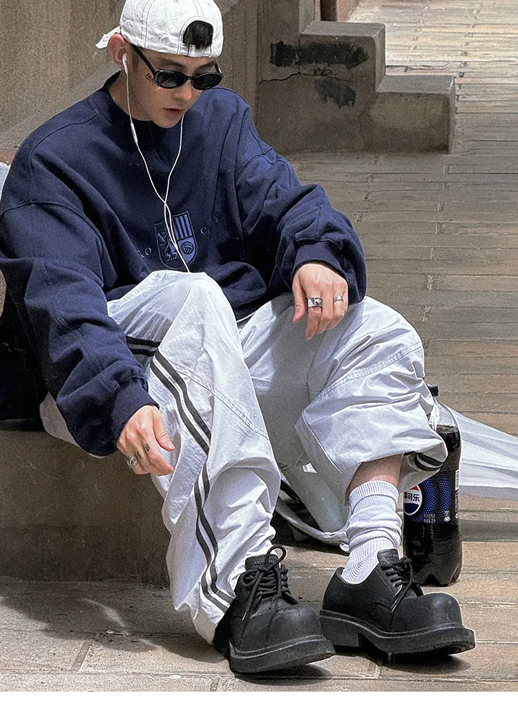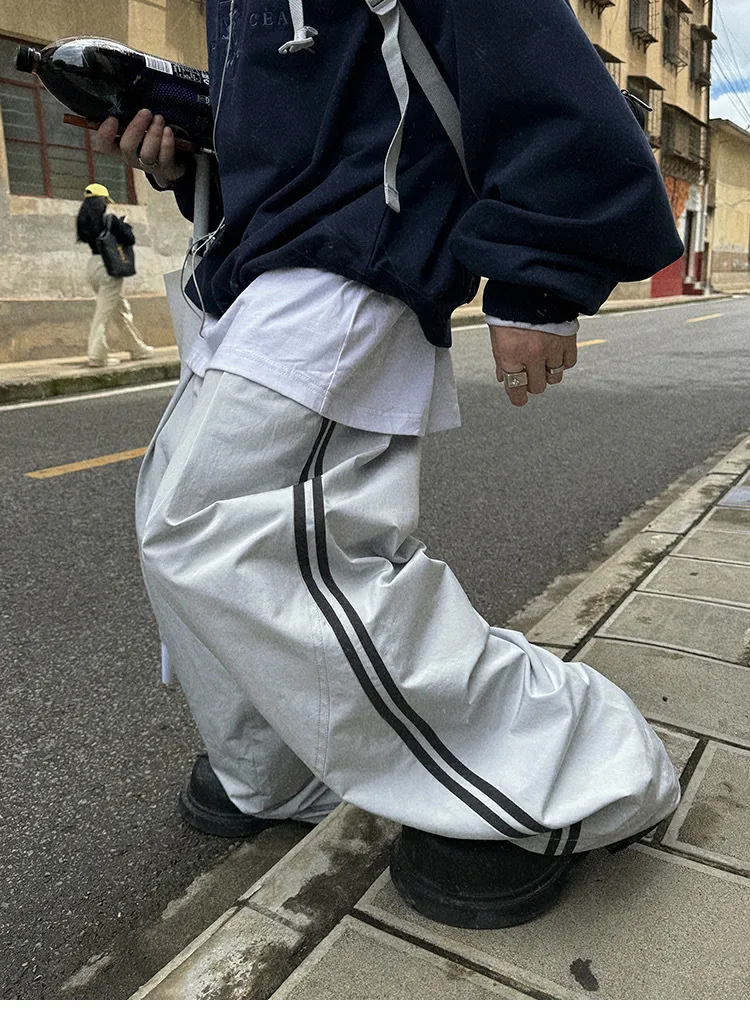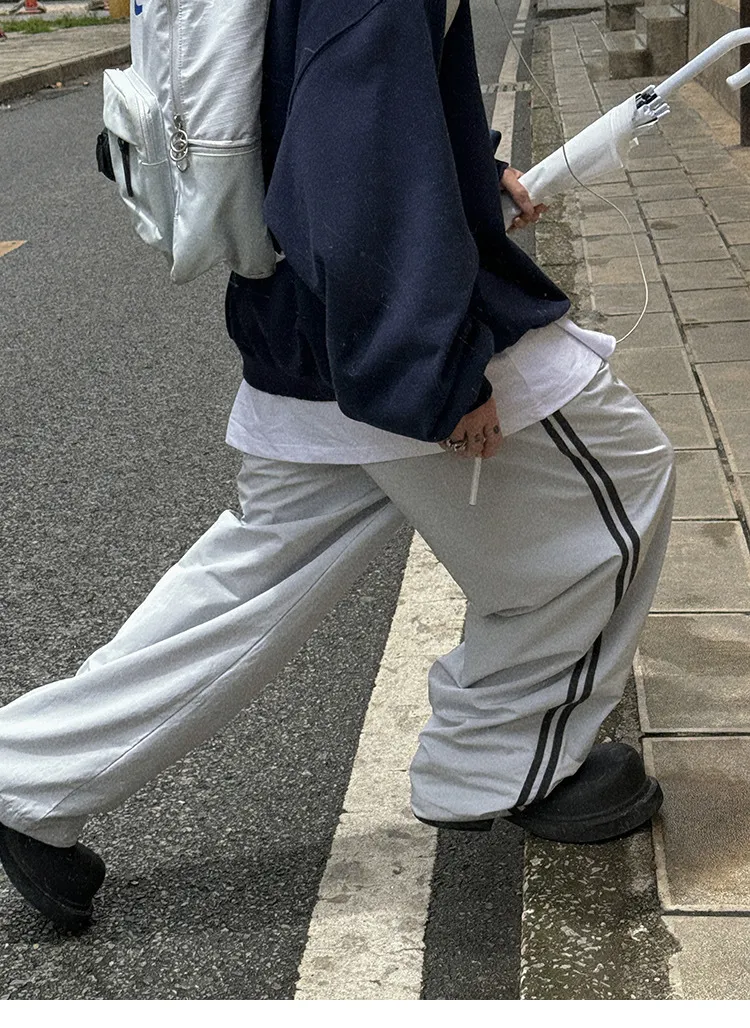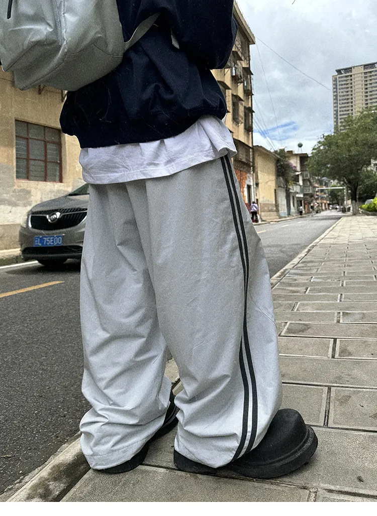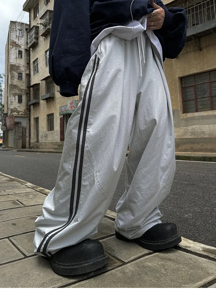 AUROCEAN 灰白 邊條 堆疊感 尼龍 運動褲 長褲(灰白色)