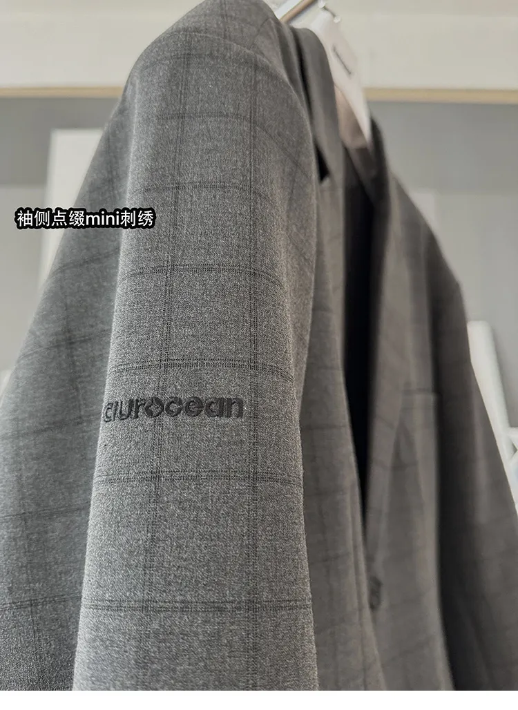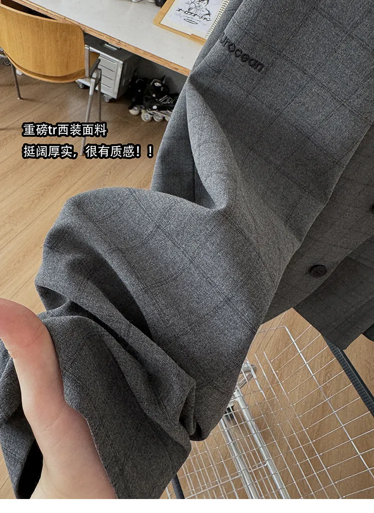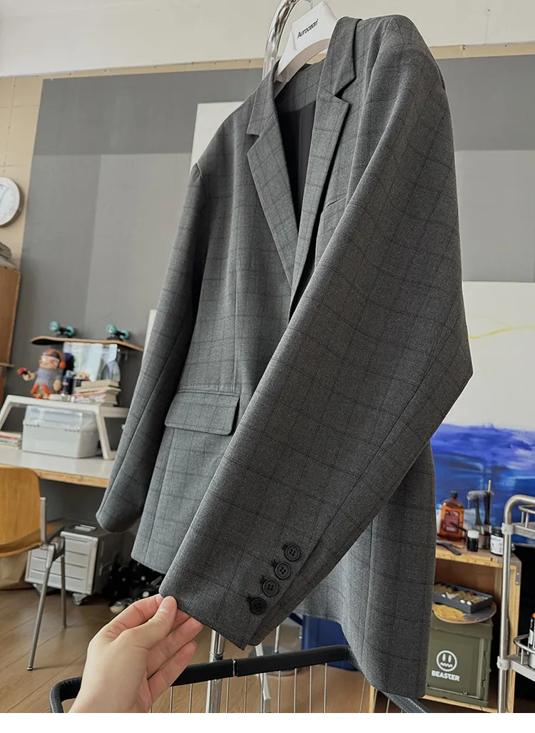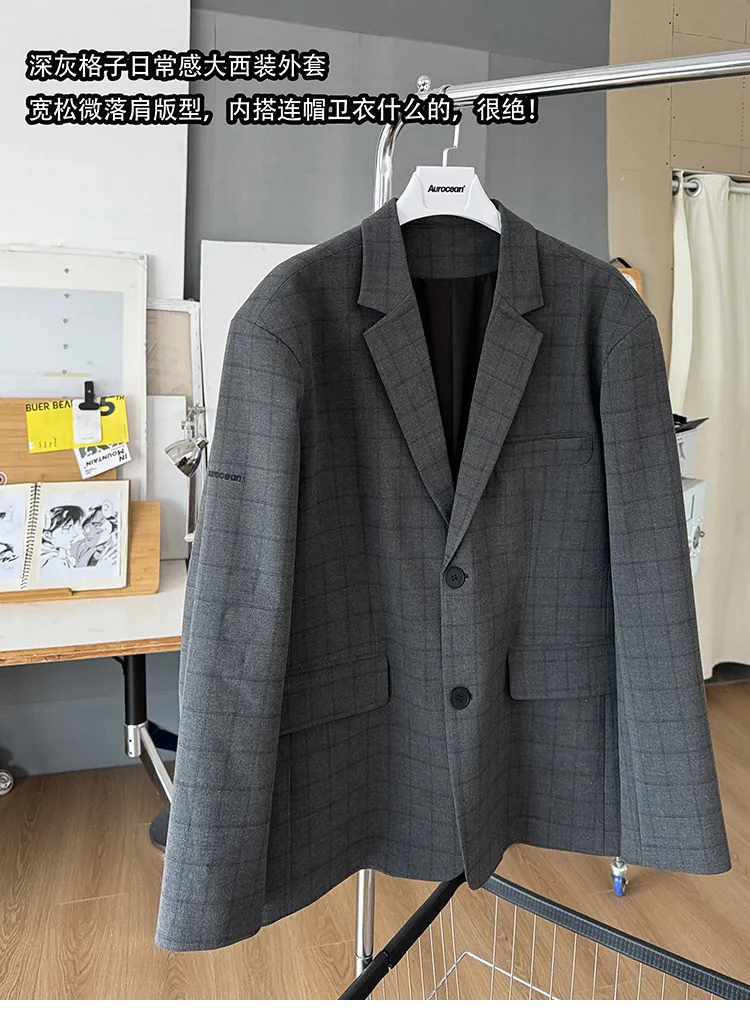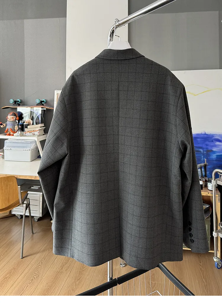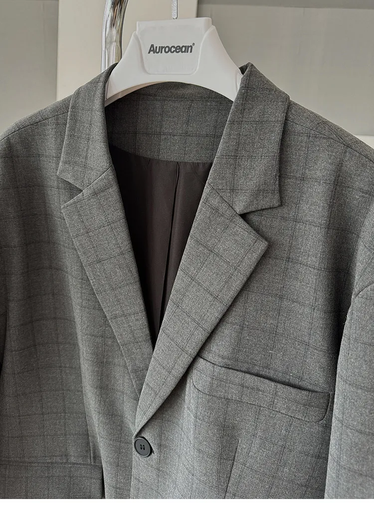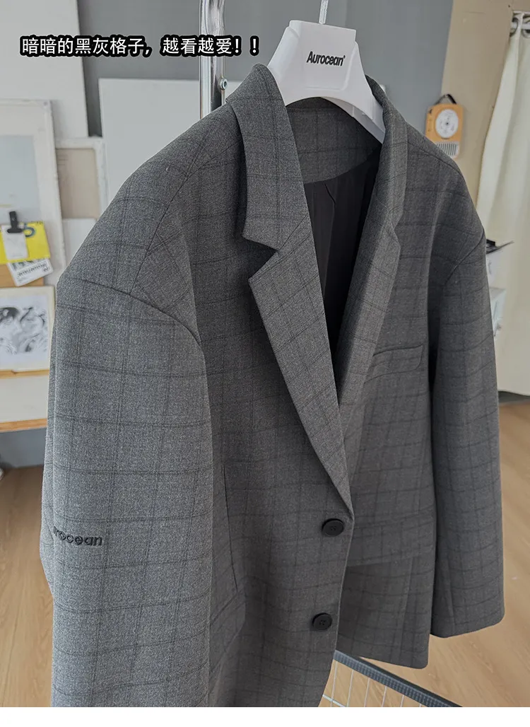 AUROCEAN 日常感 寬大 復古深灰 格紋 西裝外套(深灰色)