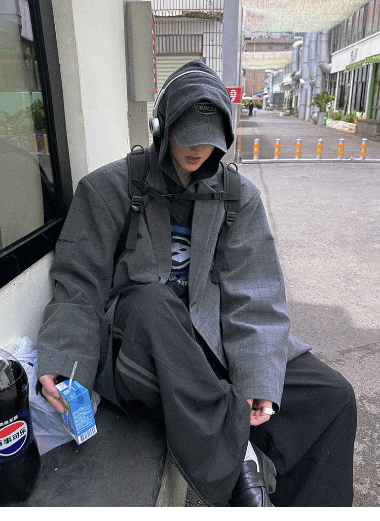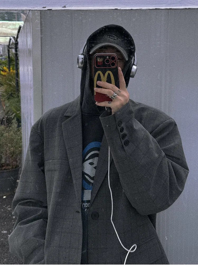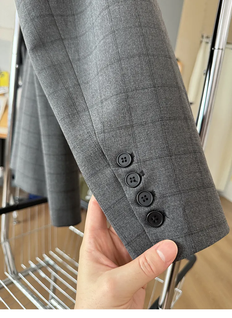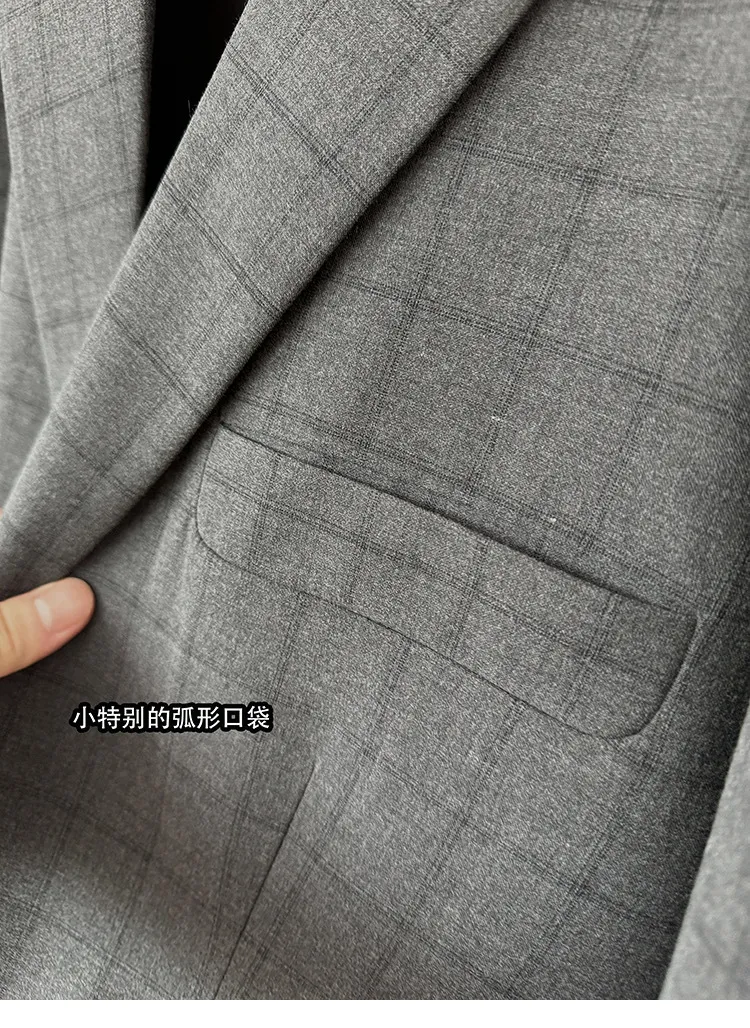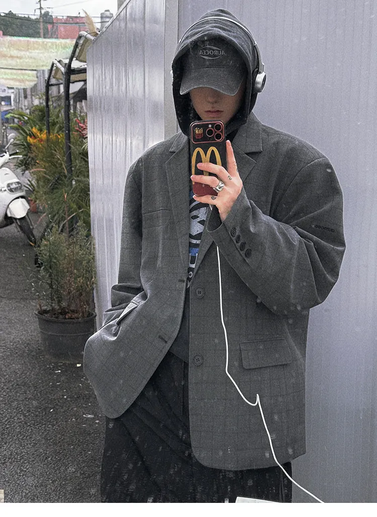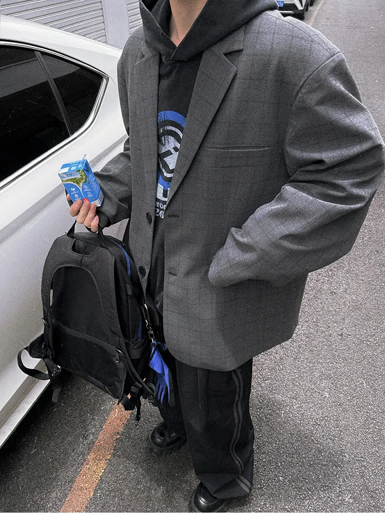 AUROCEAN 日常感 寬大 復古深灰 格紋 西裝外套(深灰色)