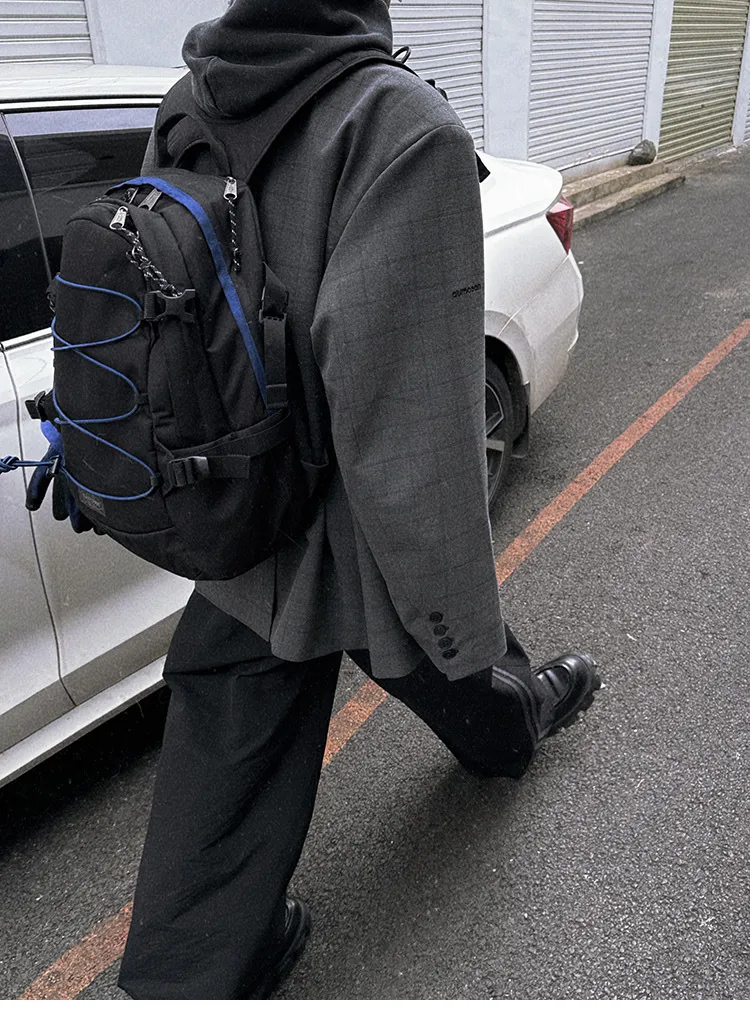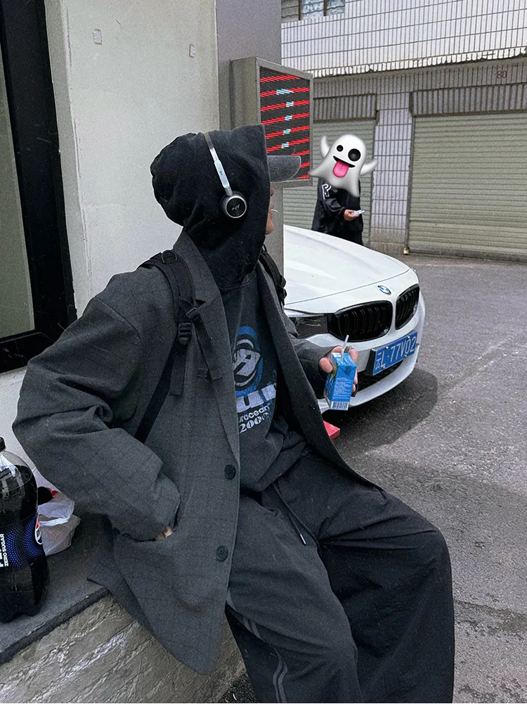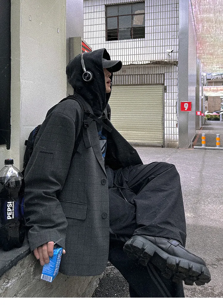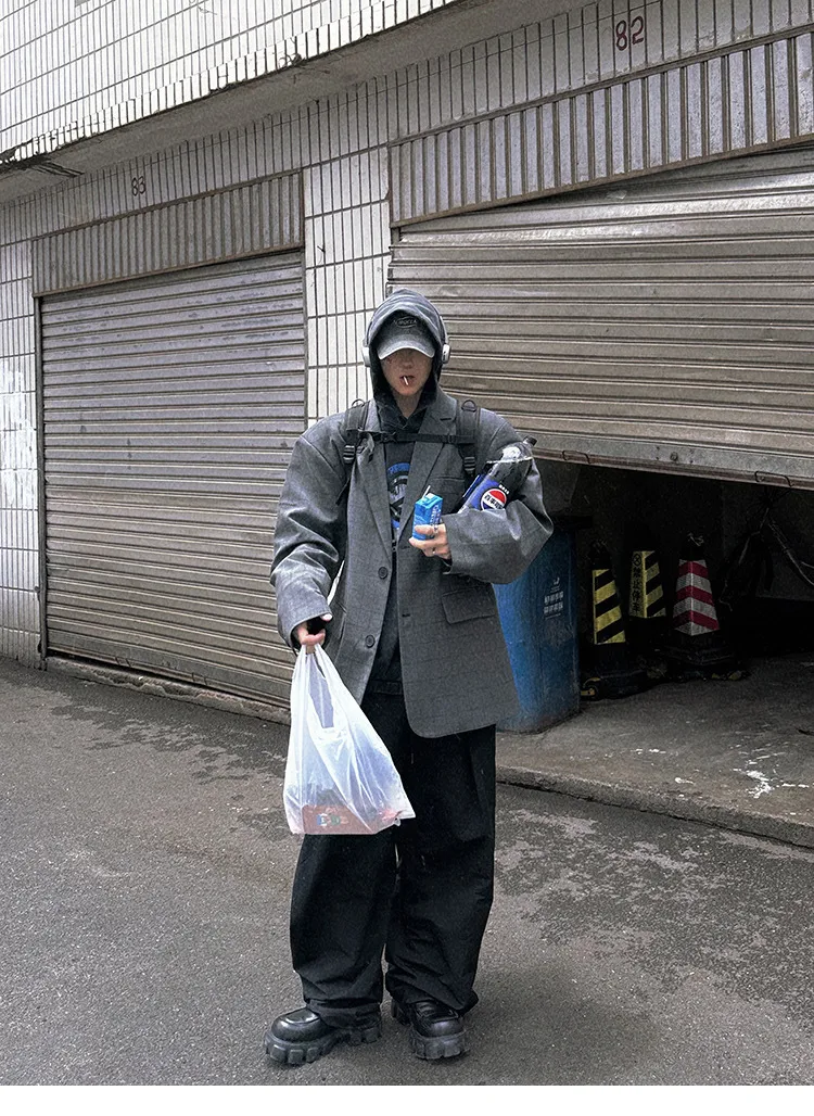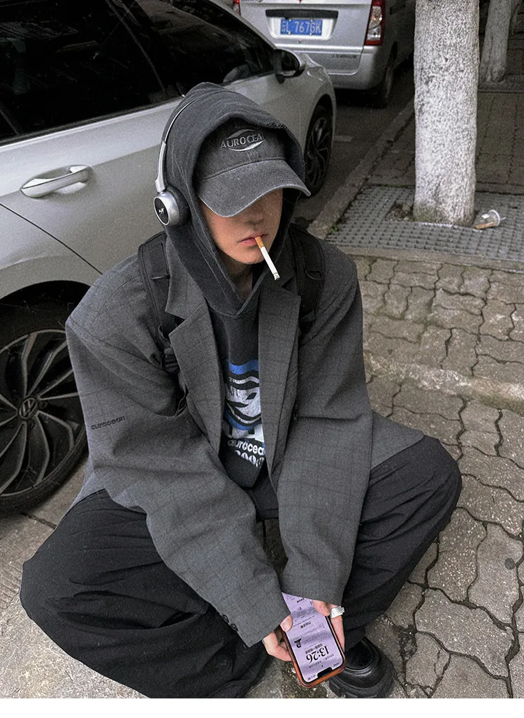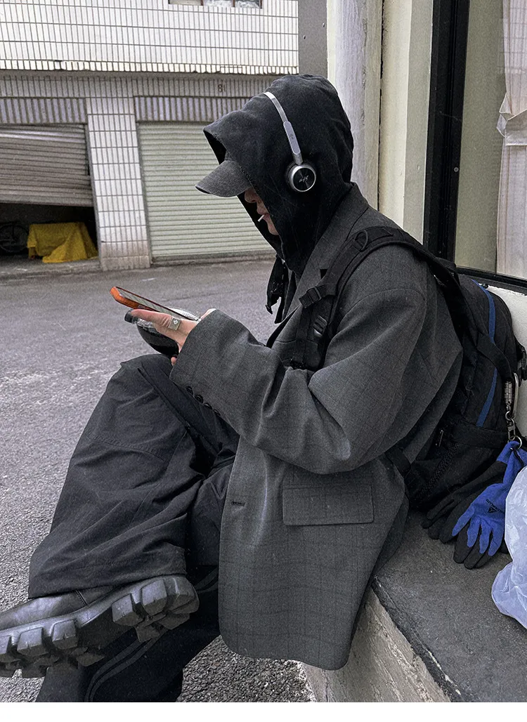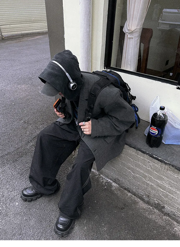 AUROCEAN 日常感 寬大 復古深灰 格紋 西裝外套(深灰色)