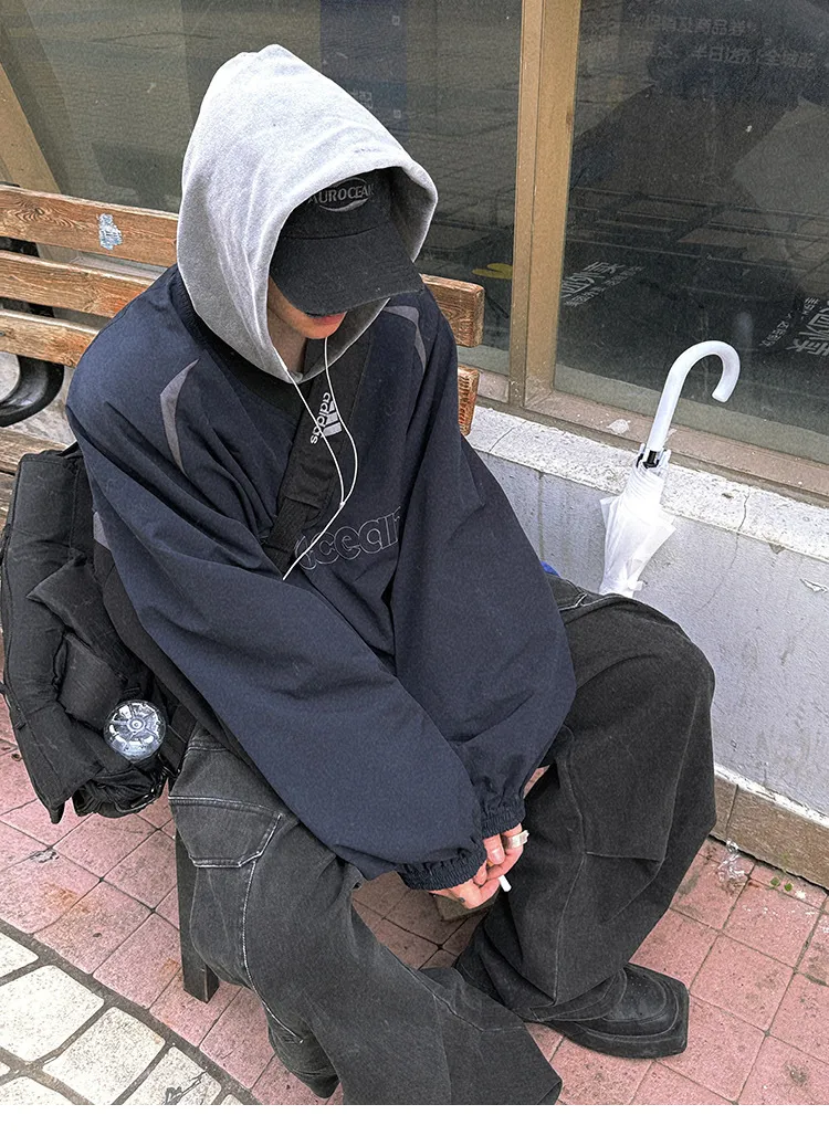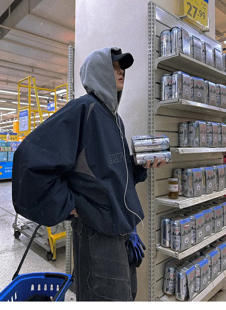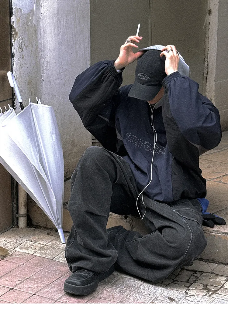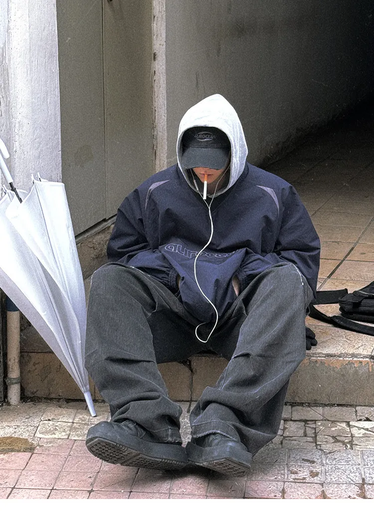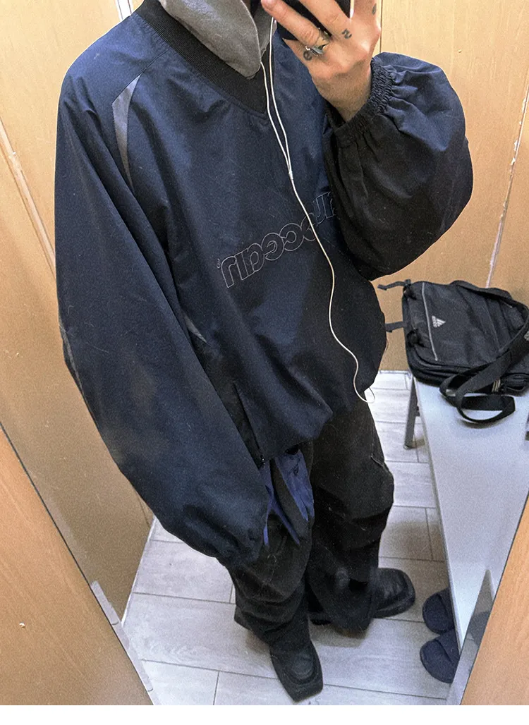 AUROCEAN 古著感 尼龍拼接 短寬 防風外套(藏青色)