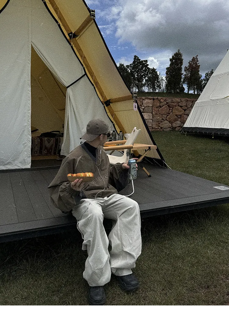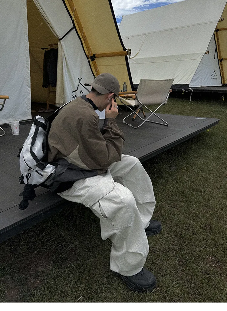 AUROCEAN 純棉 水洗 大口袋 長褲 工裝褲 闊腿褲(卡其色)