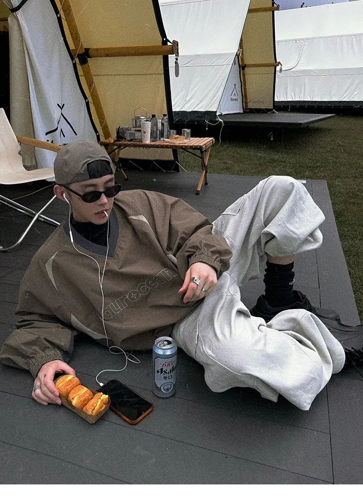 AUROCEAN 灰白 邊條 堆疊感 尼龍 運動褲 長褲(灰白色)