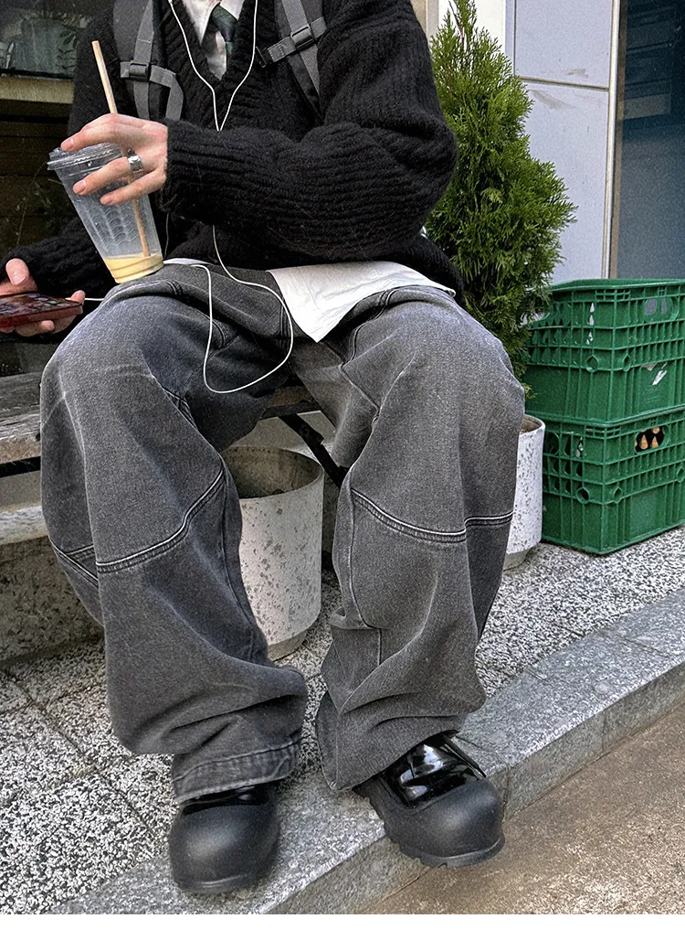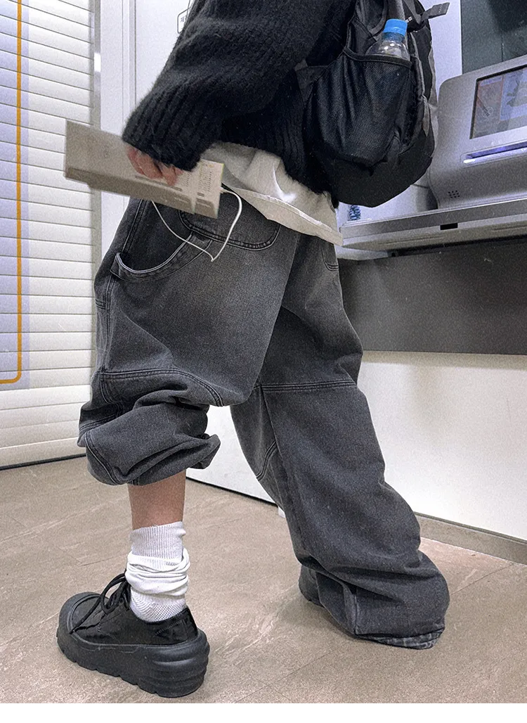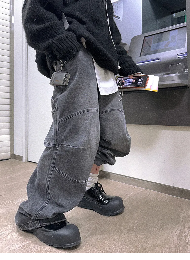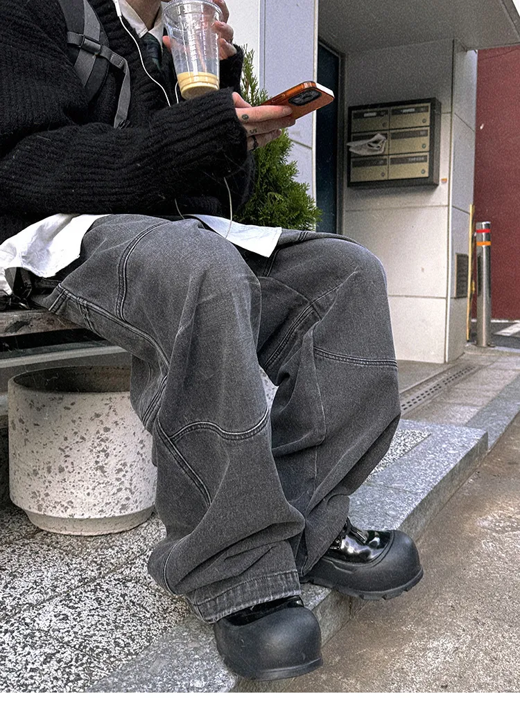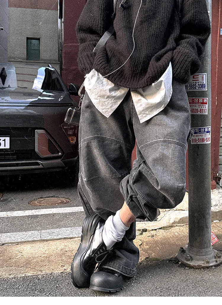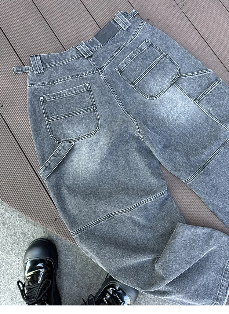 AUROCEAN 灰色水洗 重磅 立體剪裁 工裝 牛仔褲(灰色)
