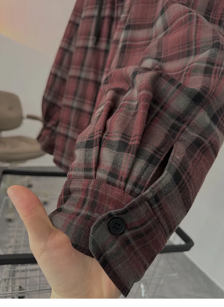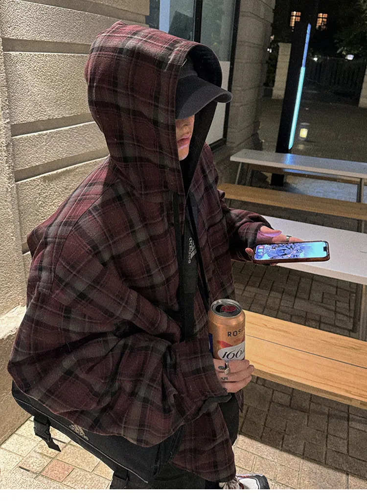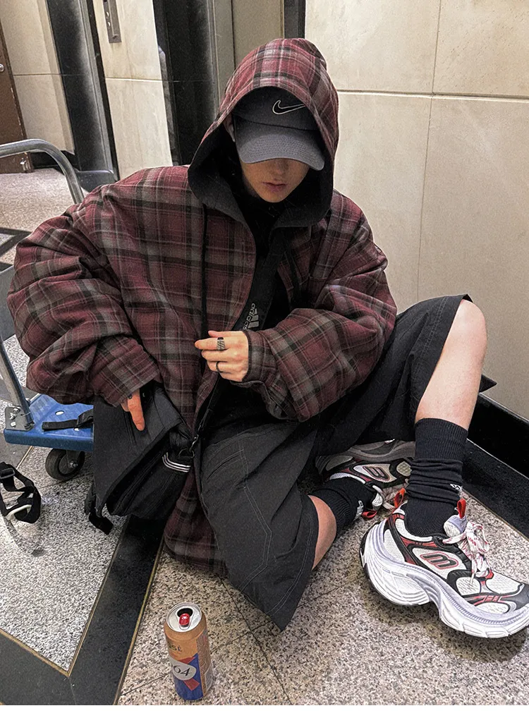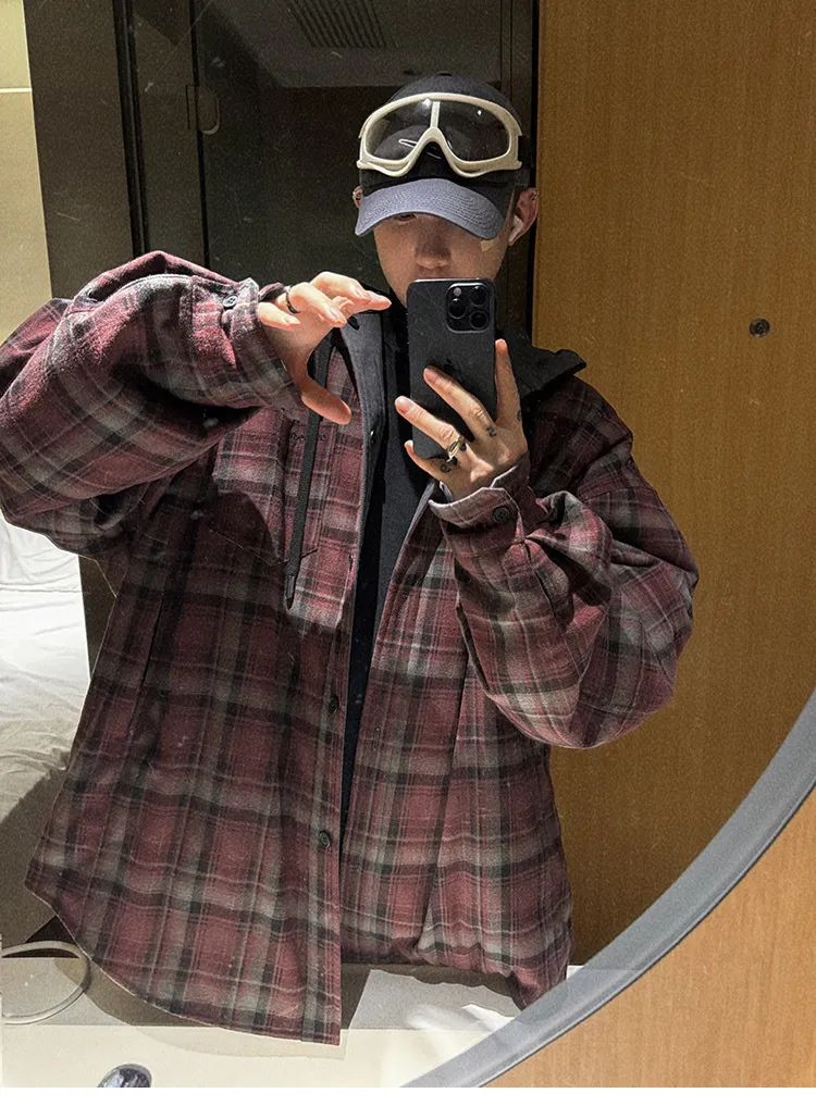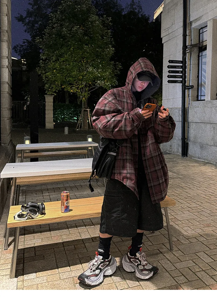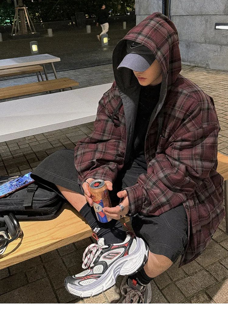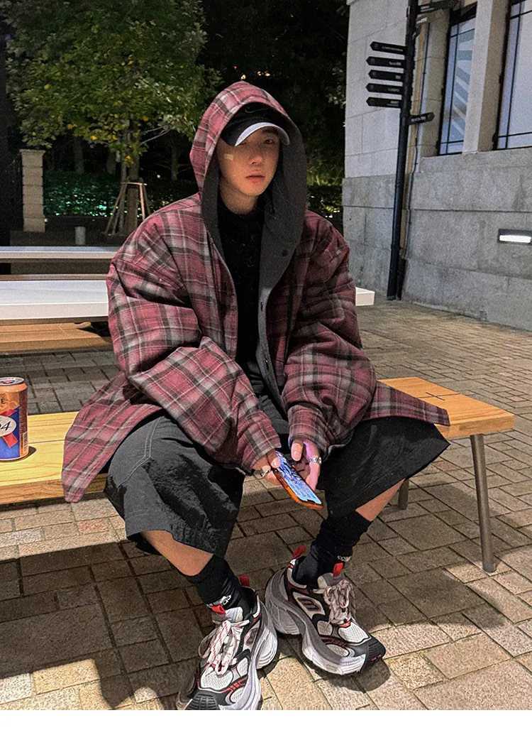 AUROCEAN 雙面穿 連帽 格紋 加厚 外套(紅灰)