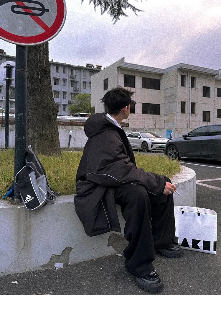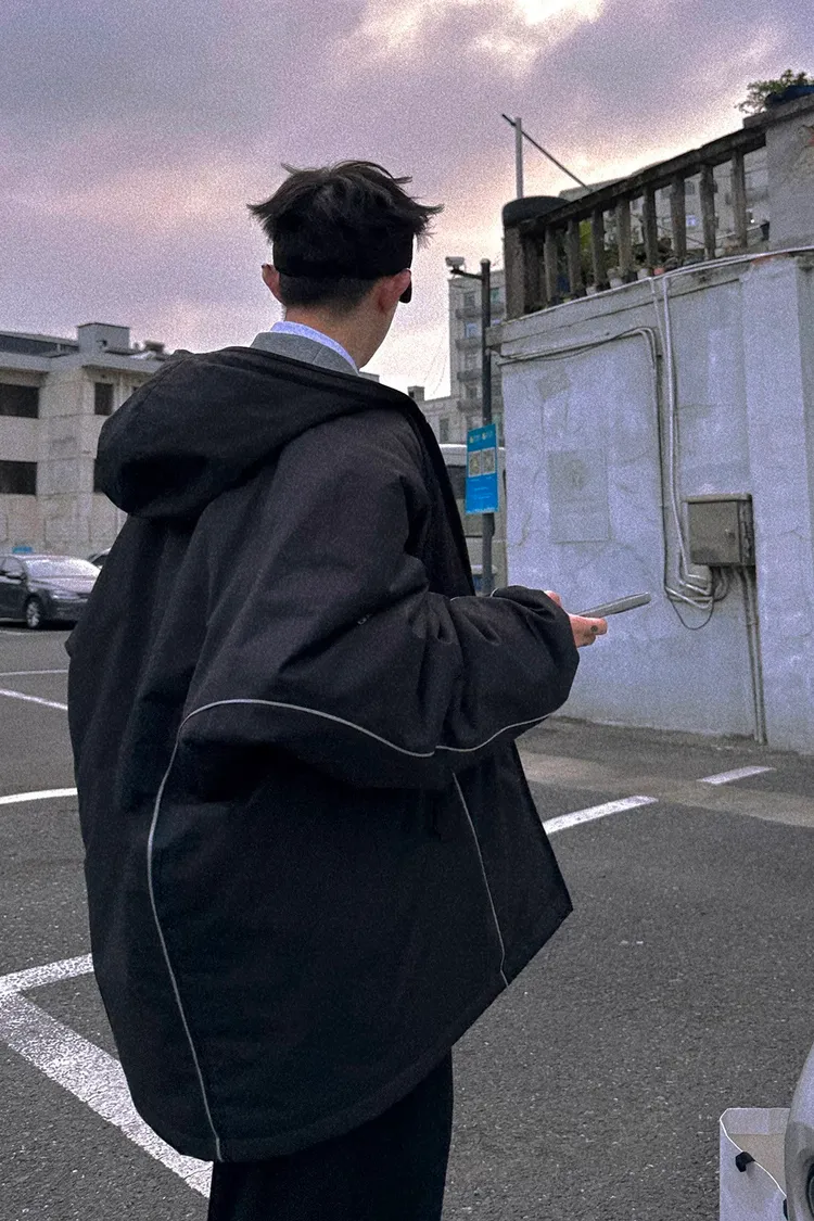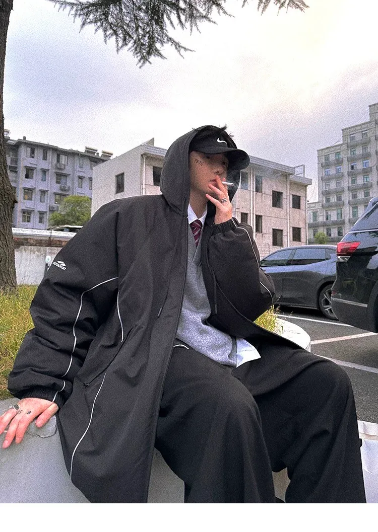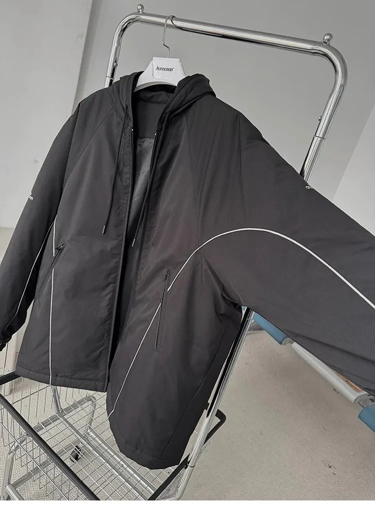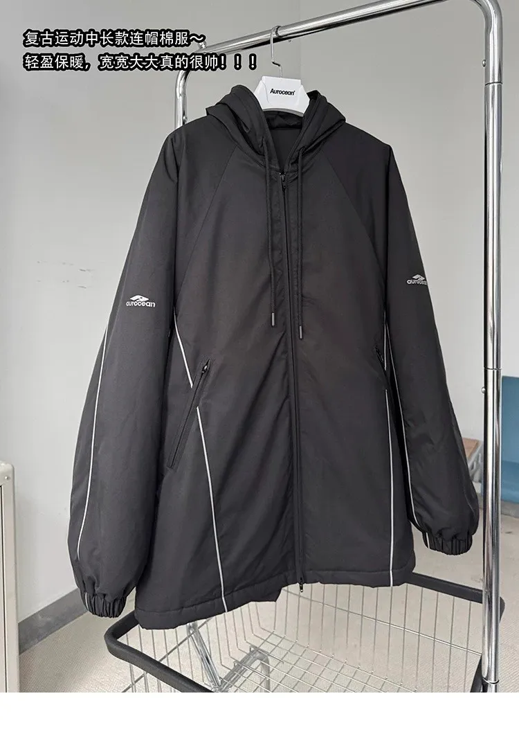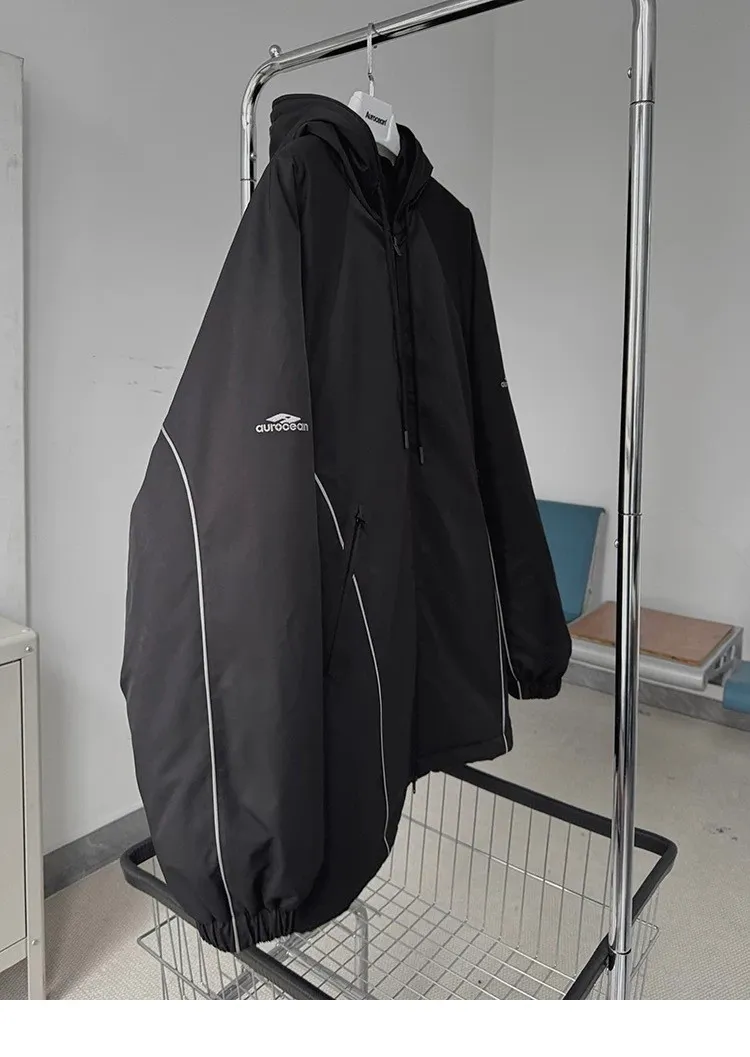 AUROCEAN 運動少年 中長款 廓形加厚 連帽外套(黑色)