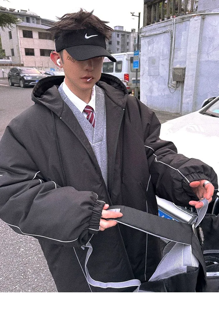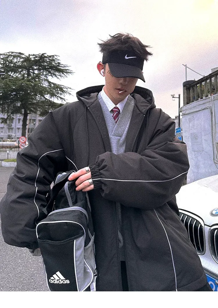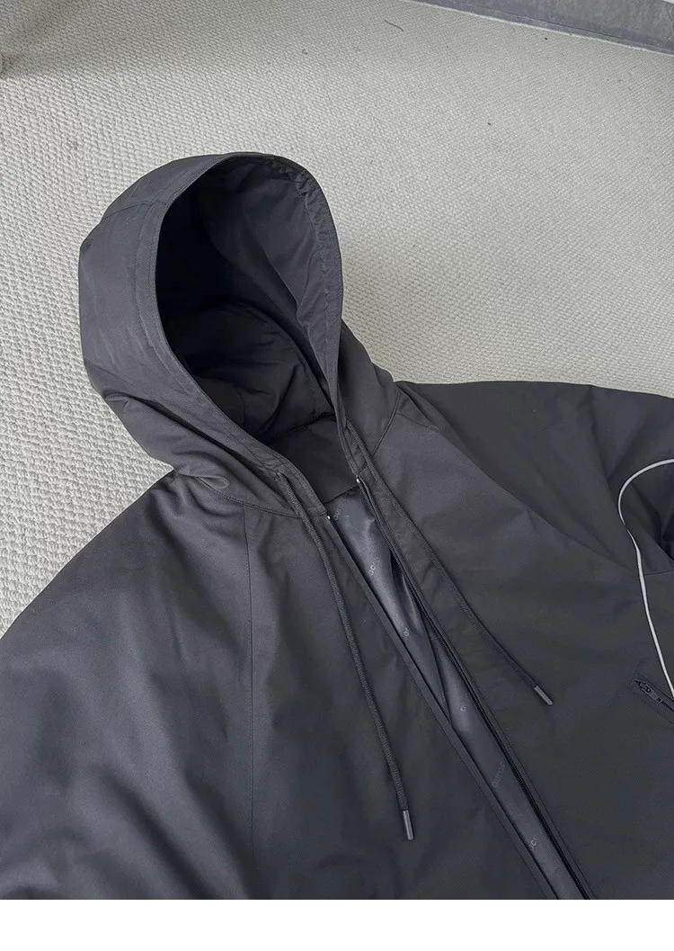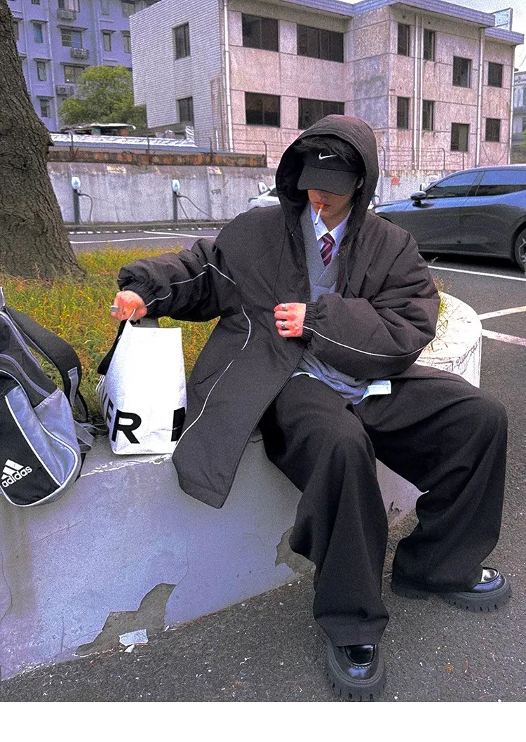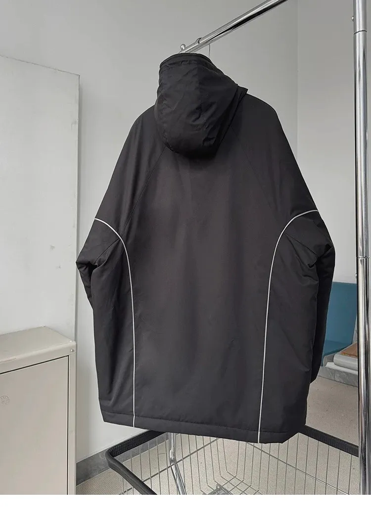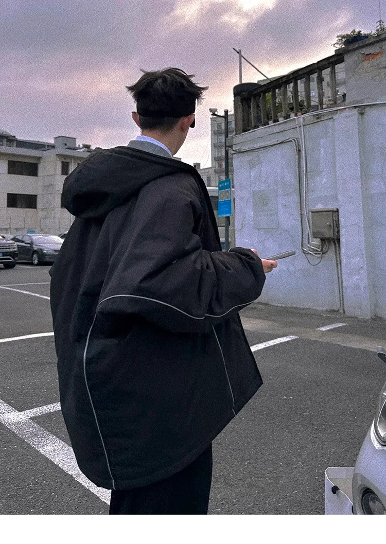 AUROCEAN 運動少年 中長款 廓形加厚 連帽外套(黑色)