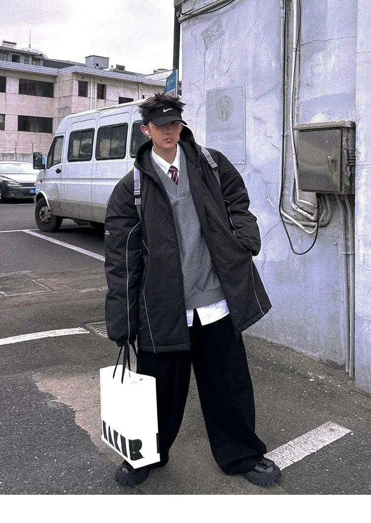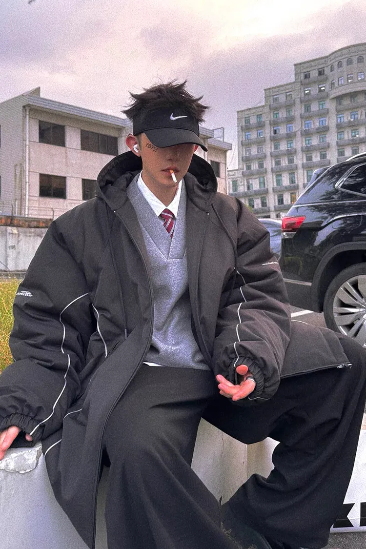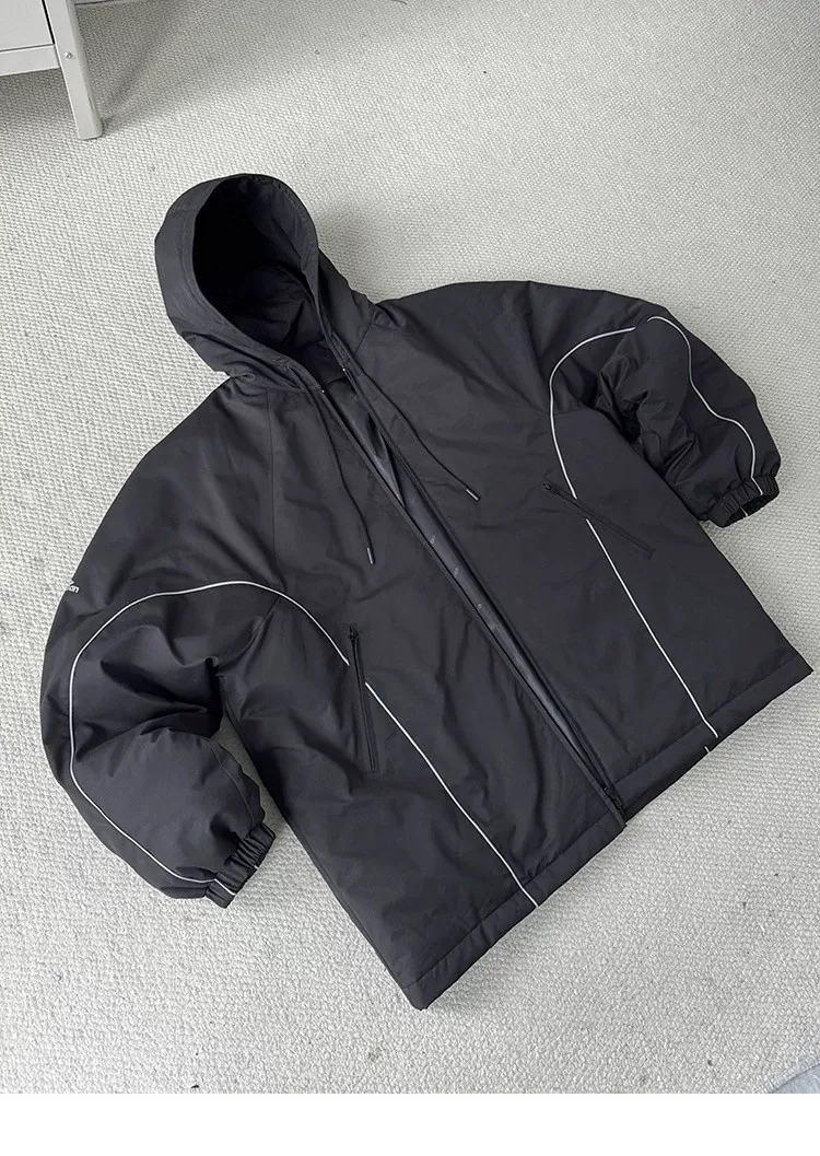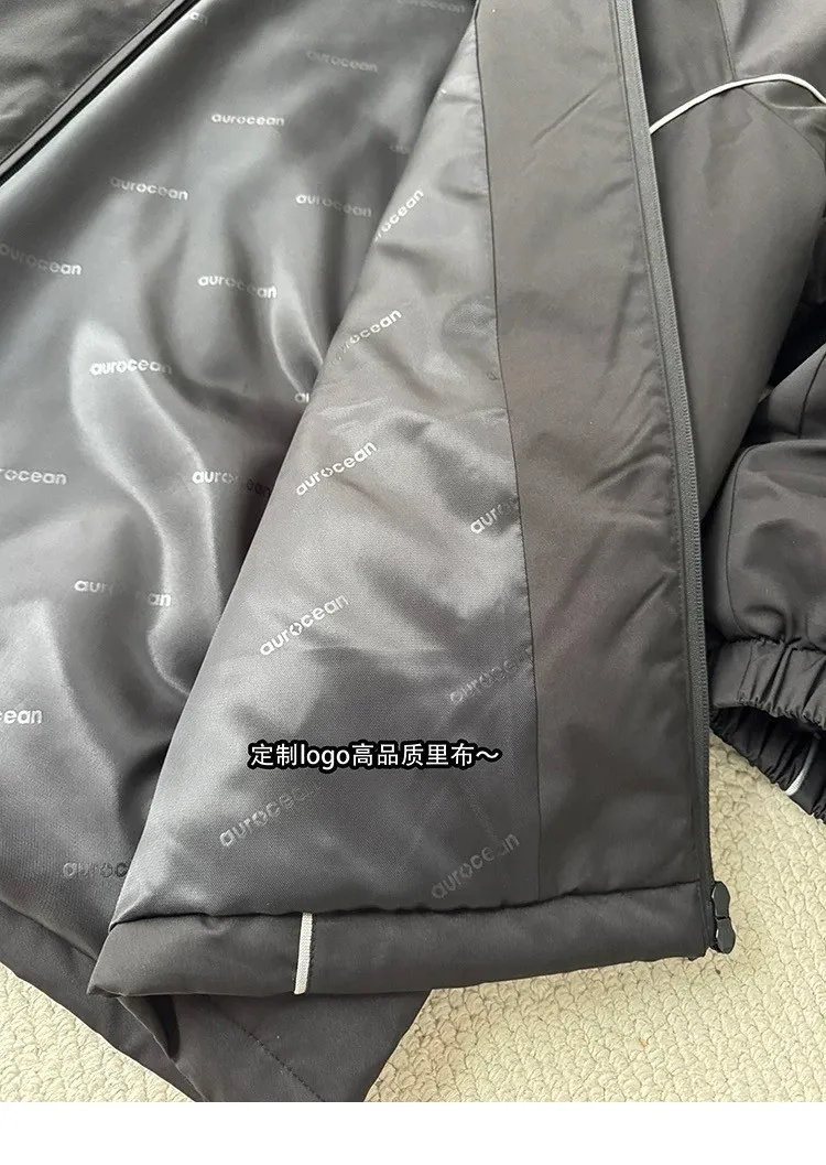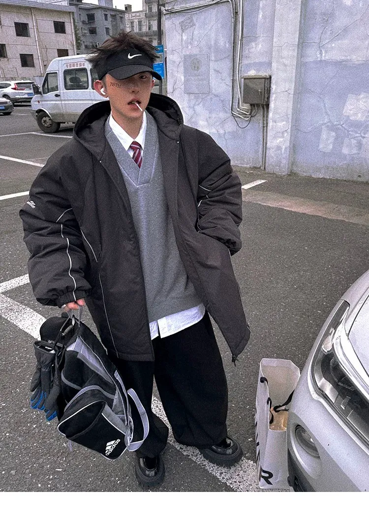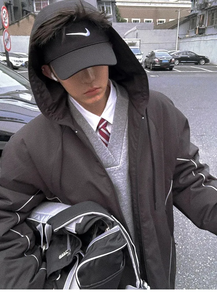 AUROCEAN 運動少年 中長款 廓形加厚 連帽外套(黑色)