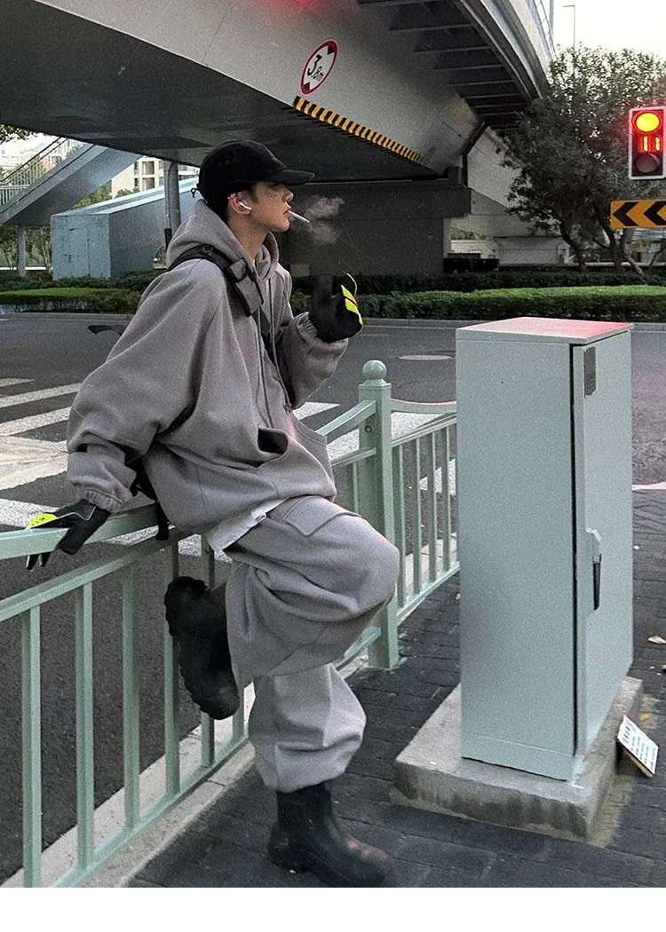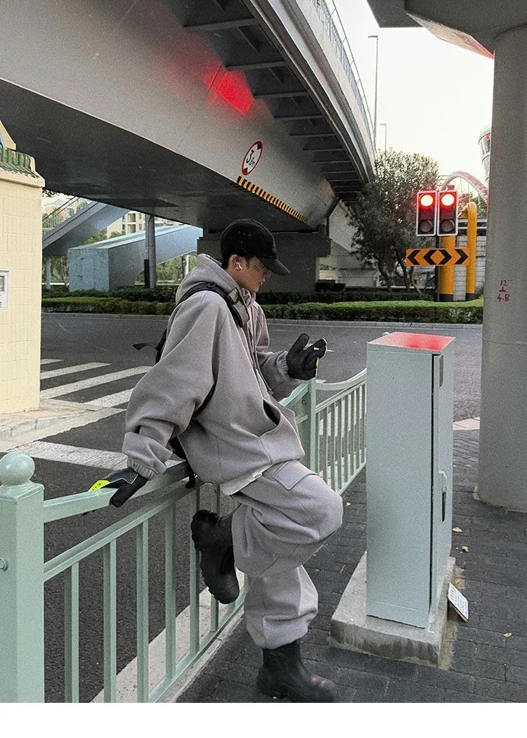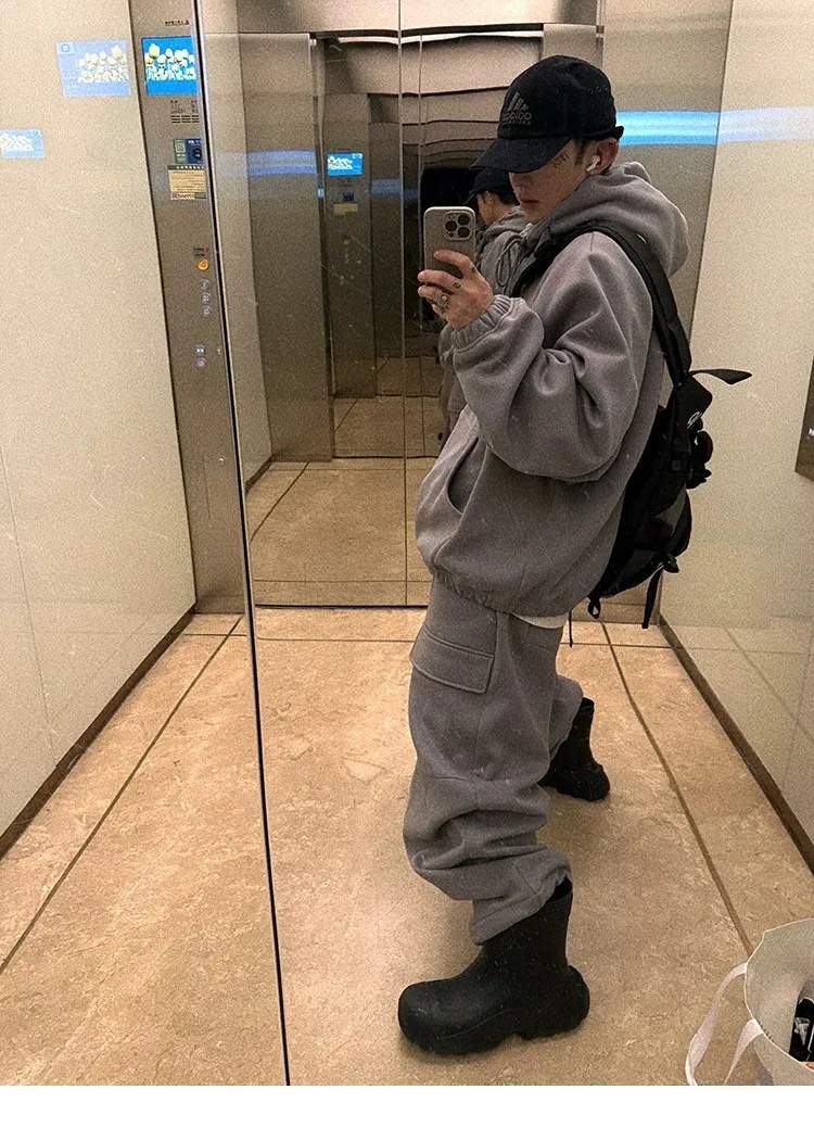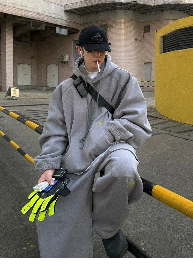 AUROCEAN 運動少年 中長款 廓形加厚 連帽外套(黑色)