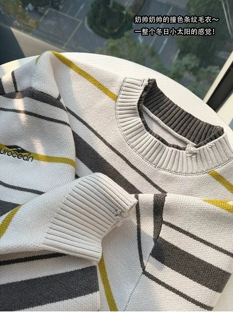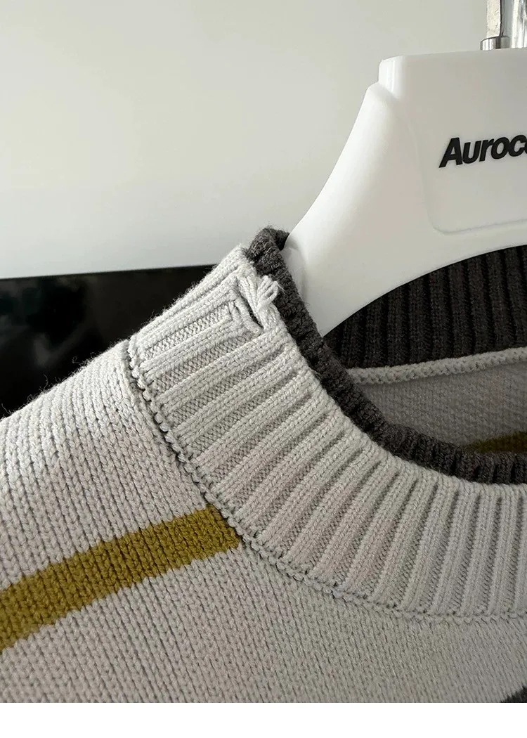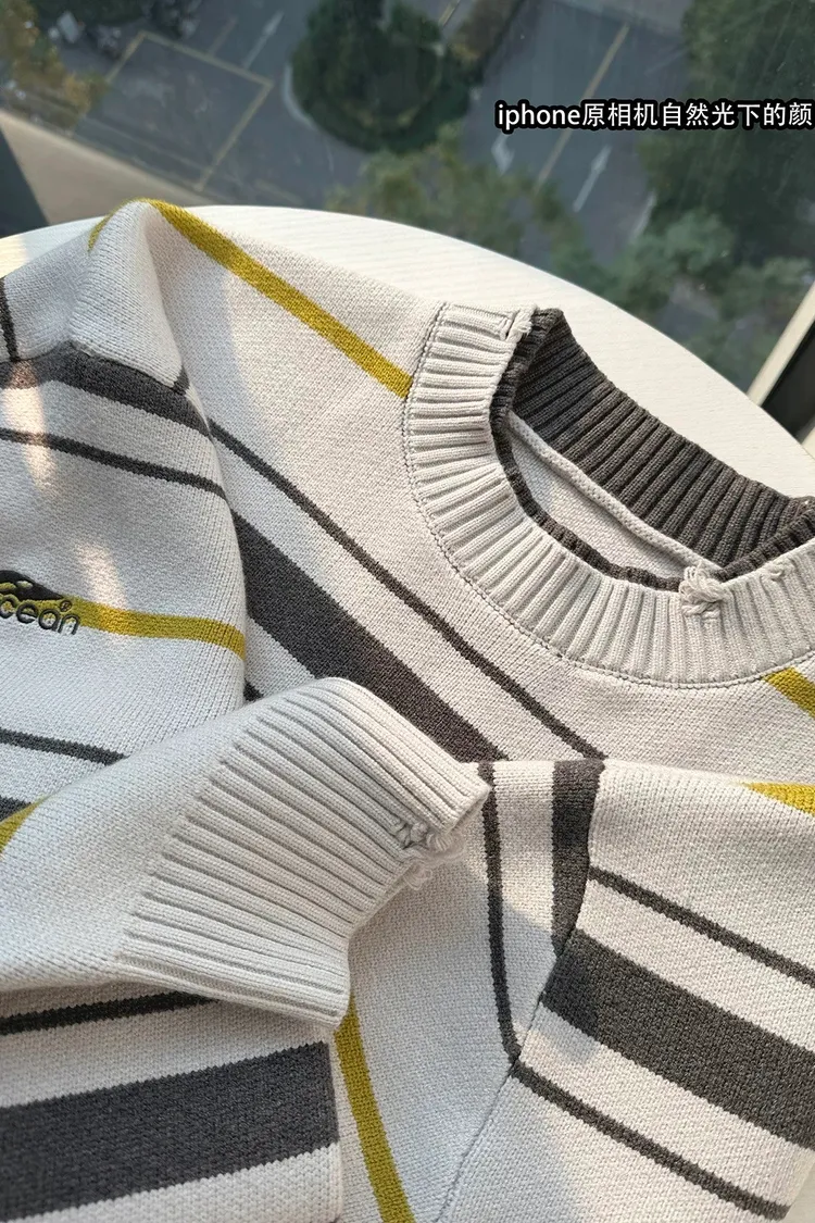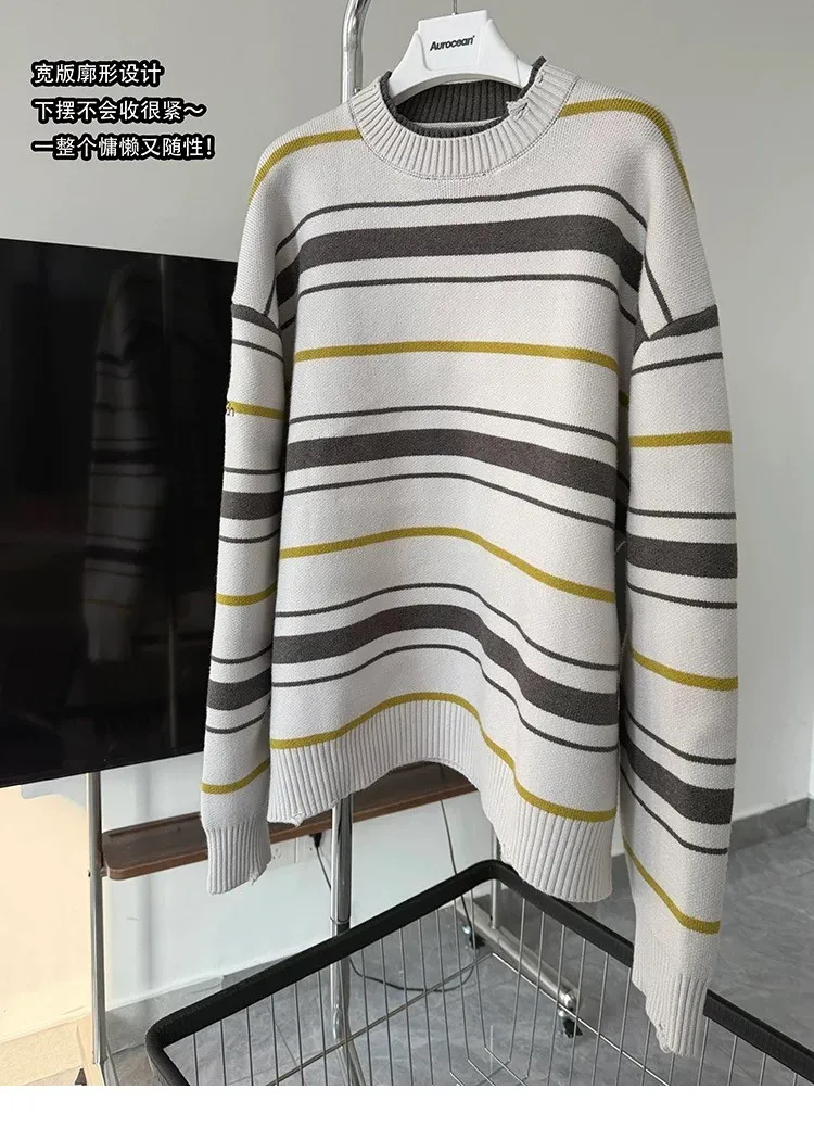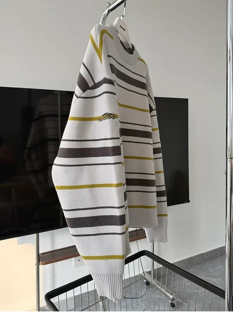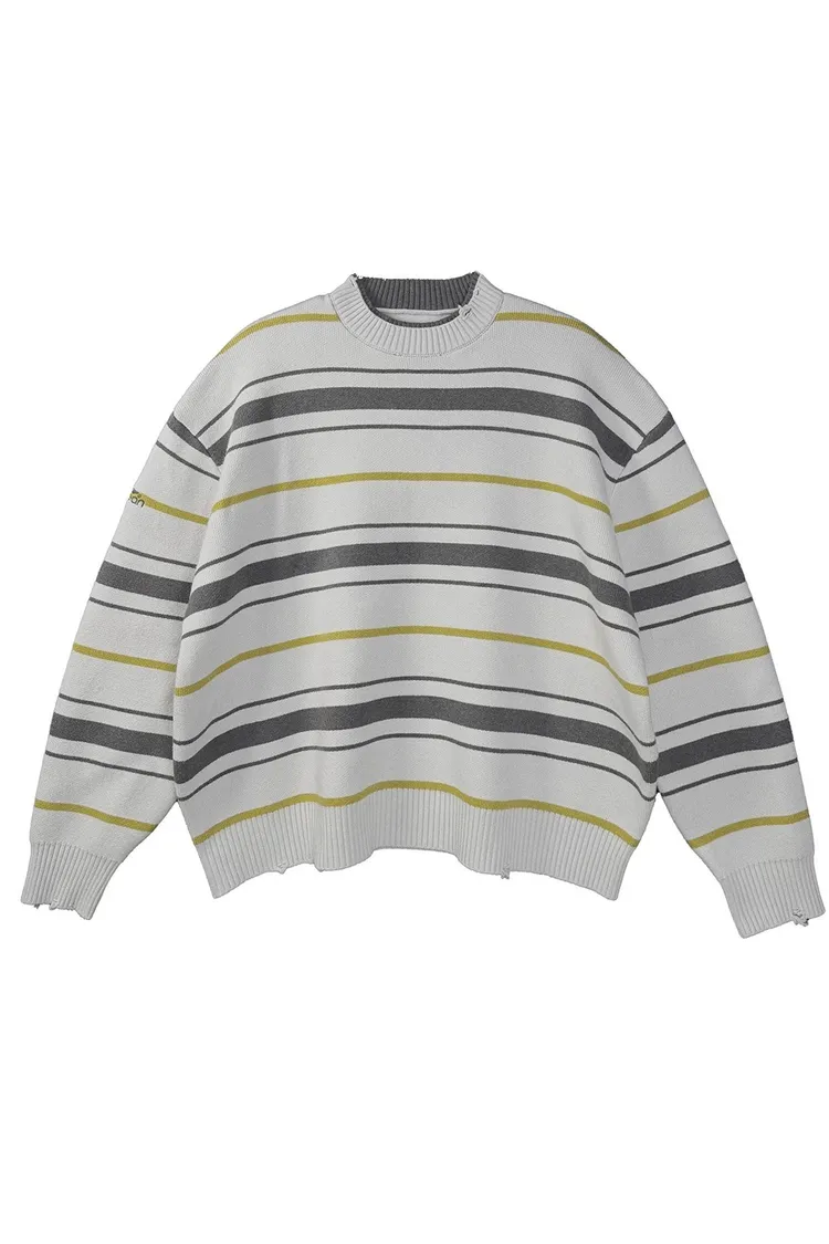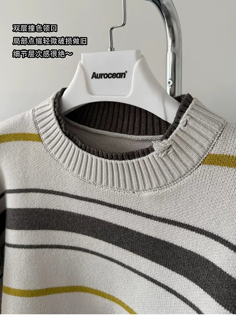 AUROCEAN 奶帥少年 破壞 撞色條紋 毛衣(奶白)
