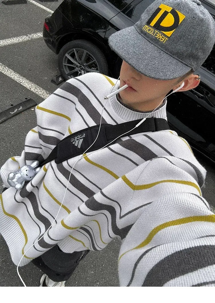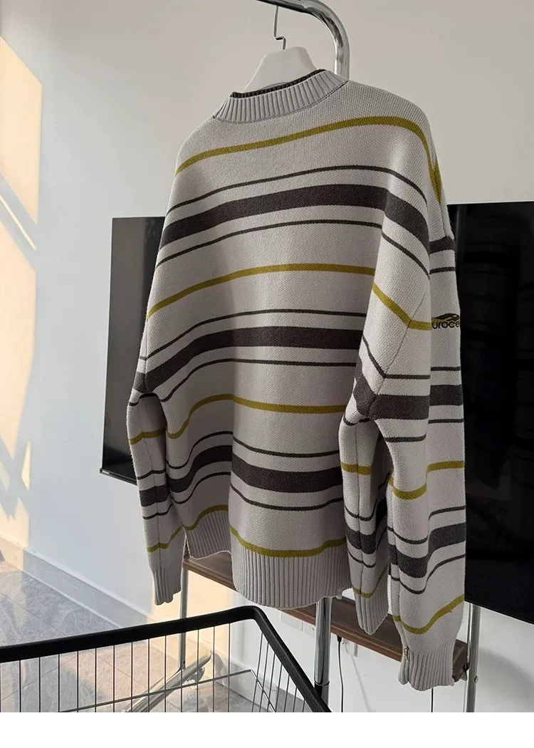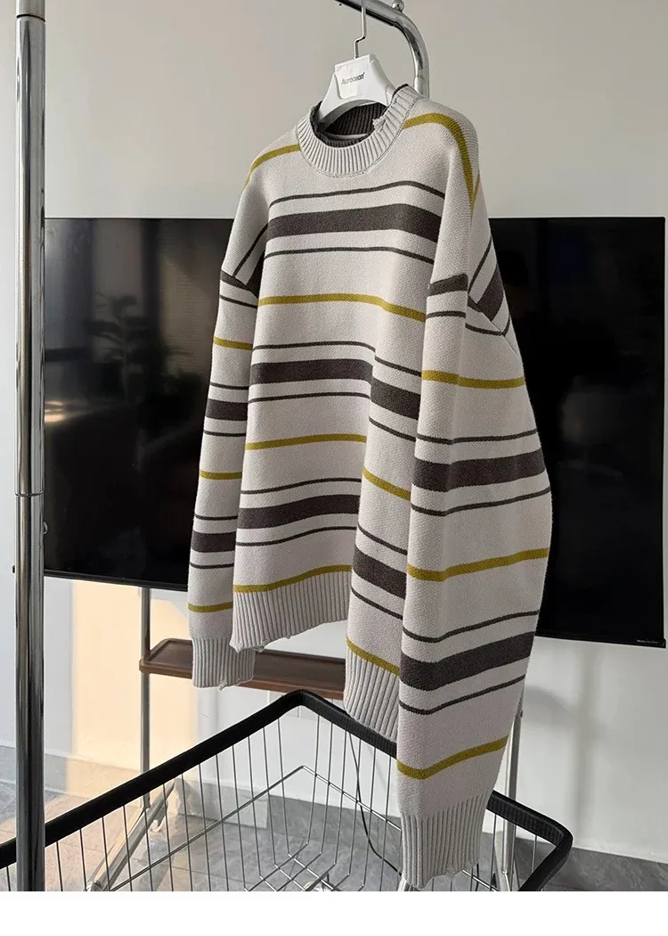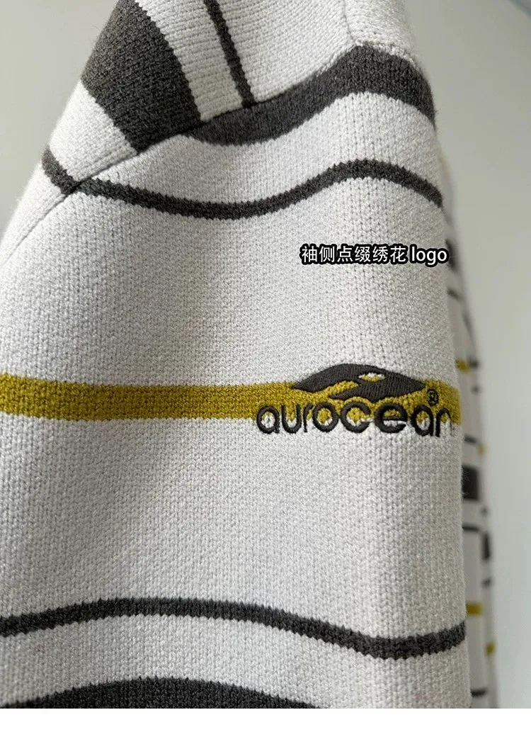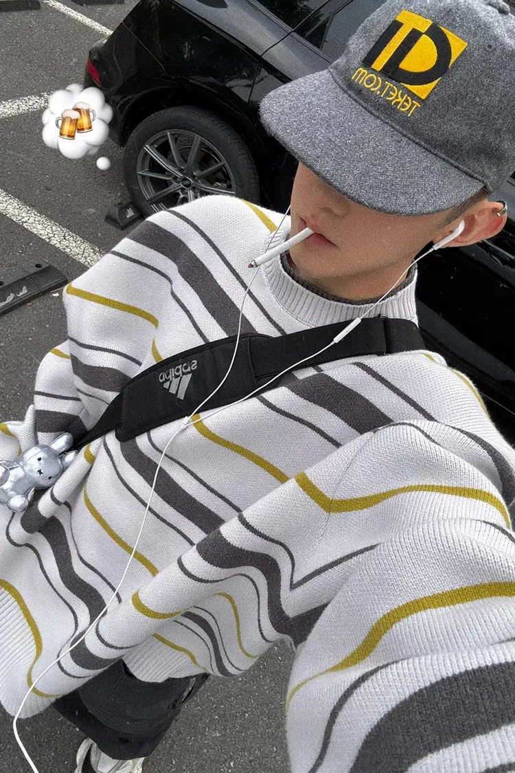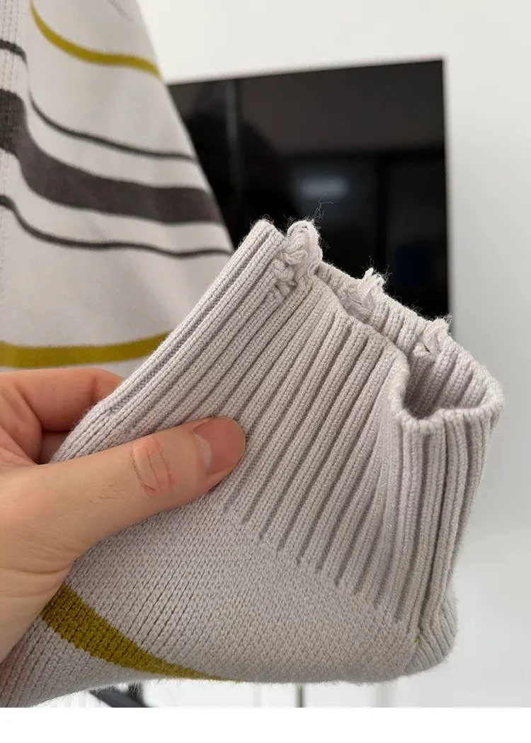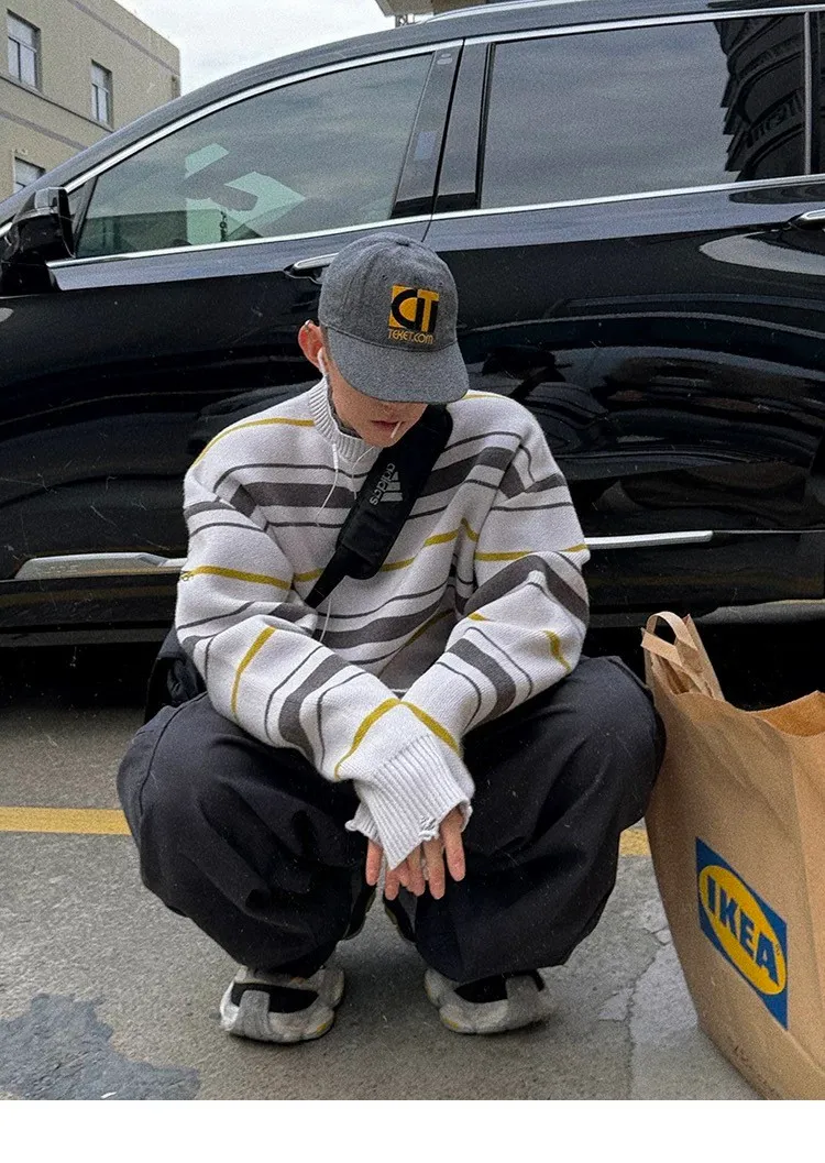 AUROCEAN 奶帥少年 破壞 撞色條紋 毛衣(奶白)