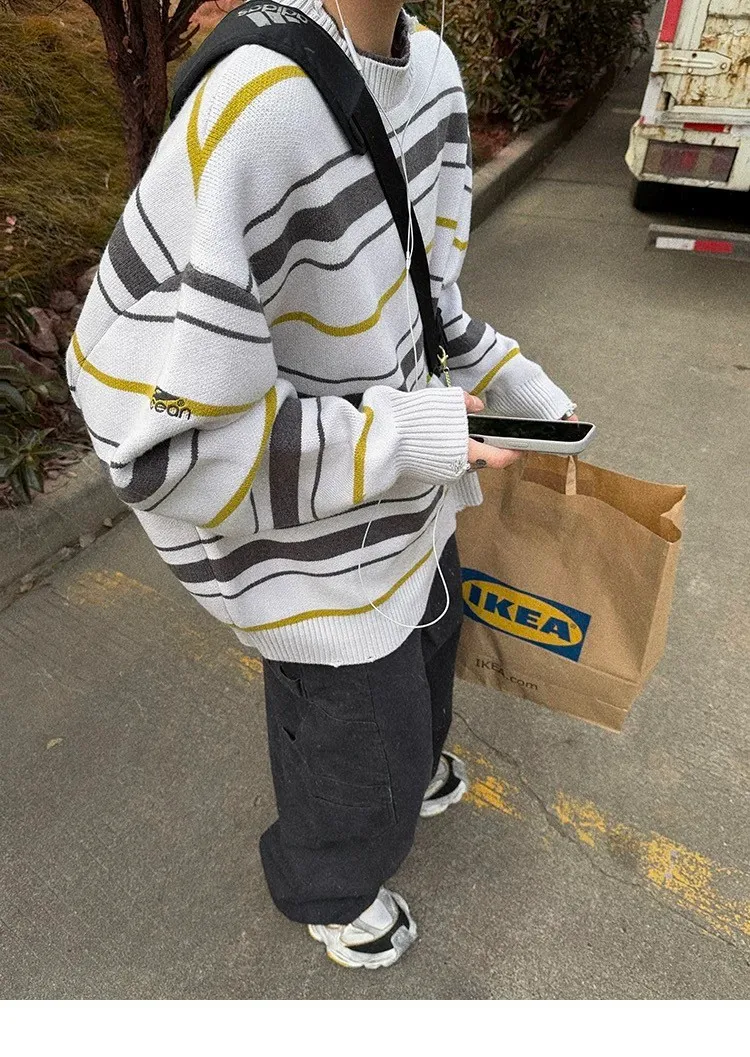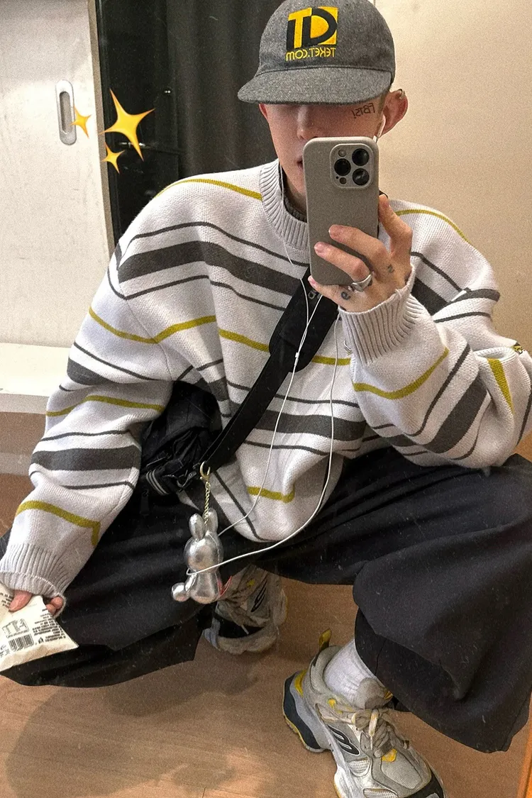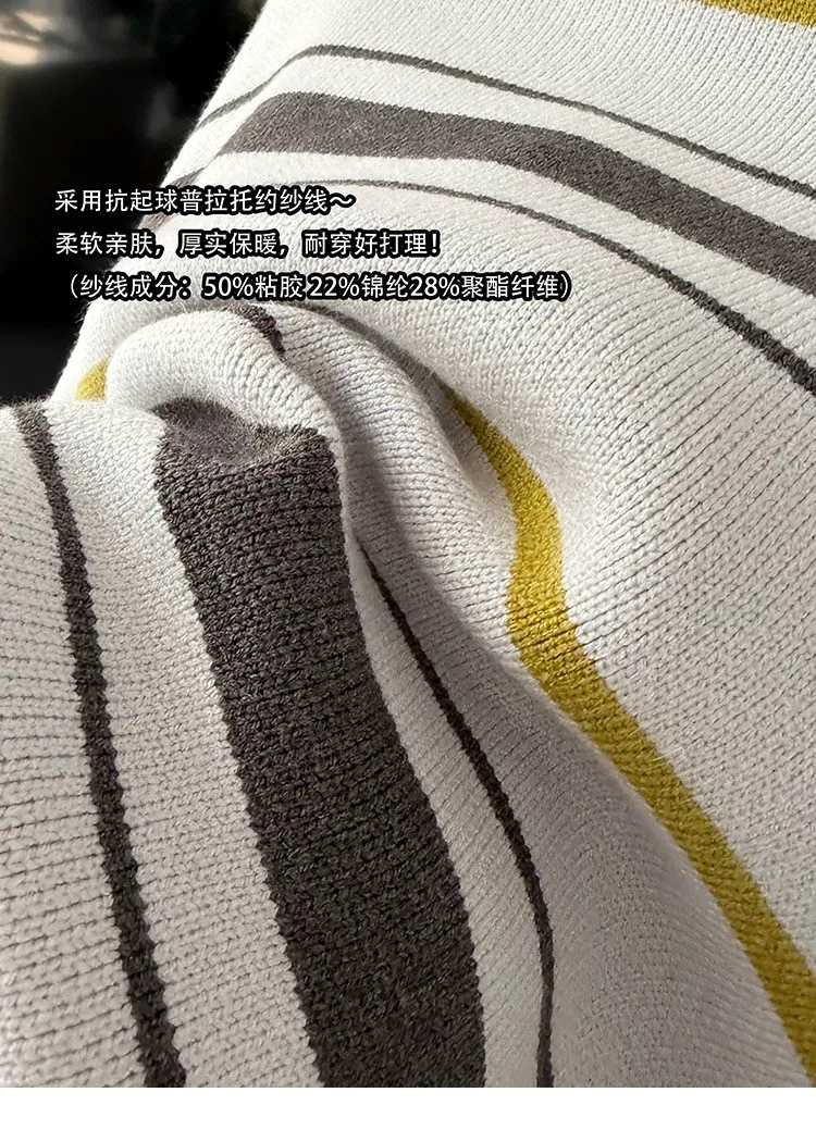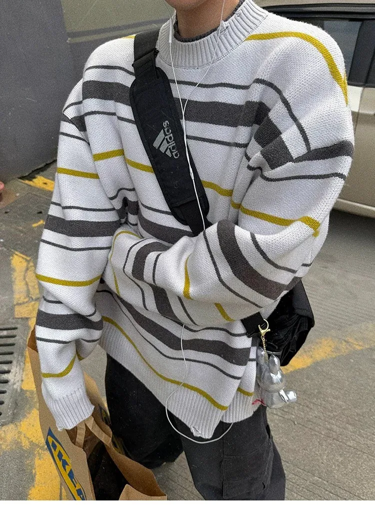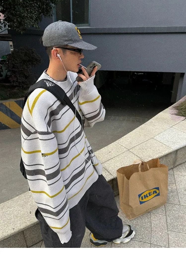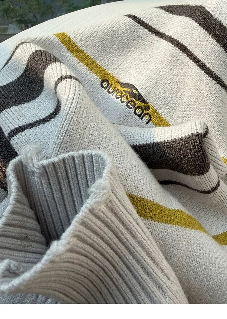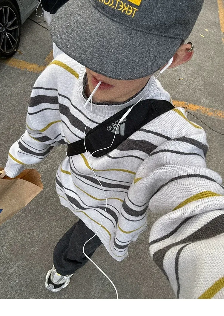 AUROCEAN 奶帥少年 破壞 撞色條紋 毛衣(奶白)