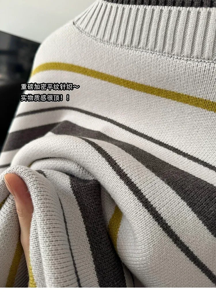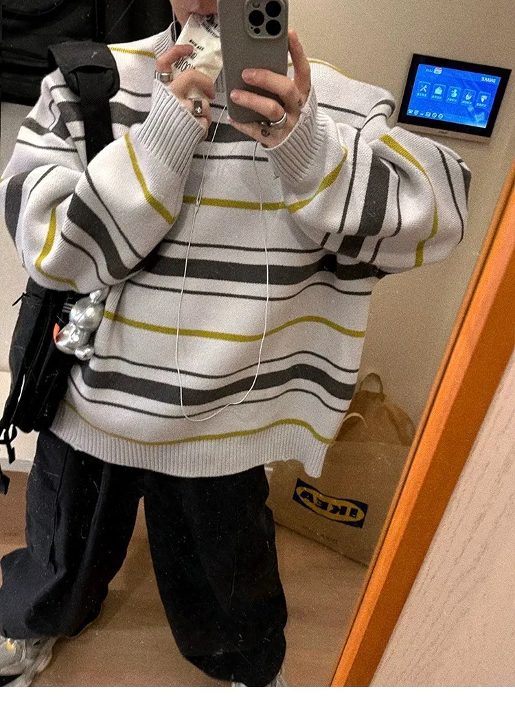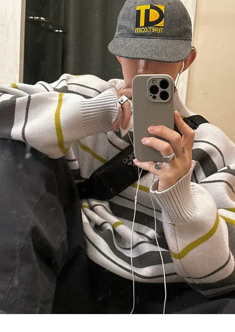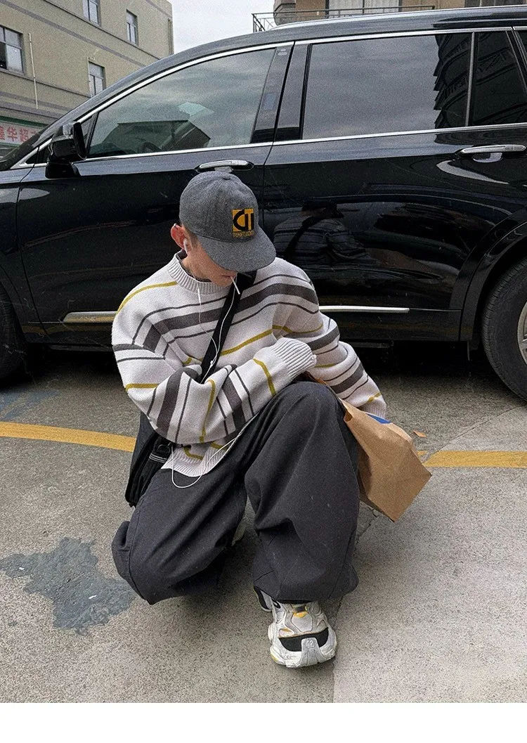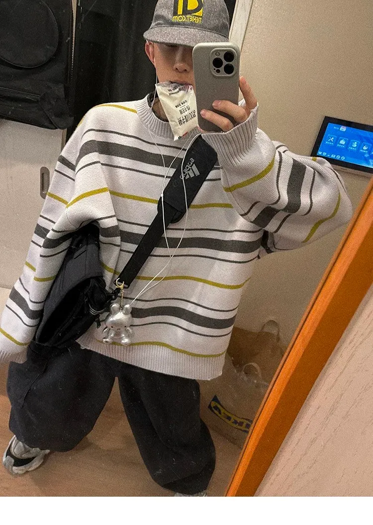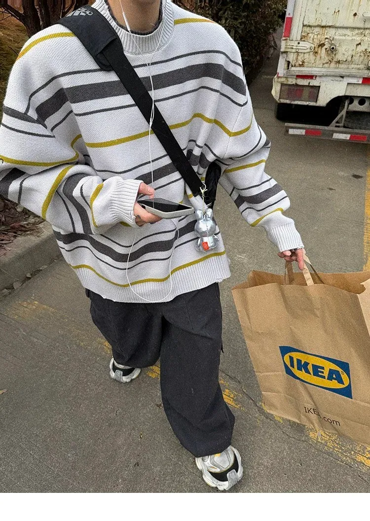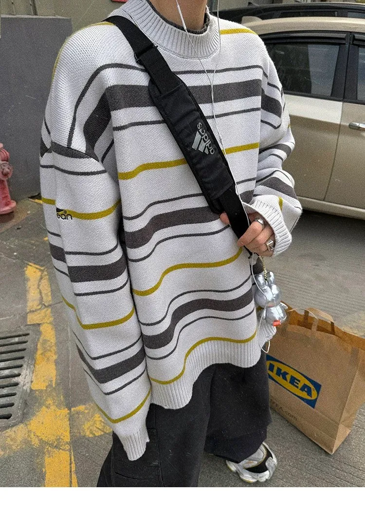 AUROCEAN 奶帥少年 破壞 撞色條紋 毛衣(奶白)