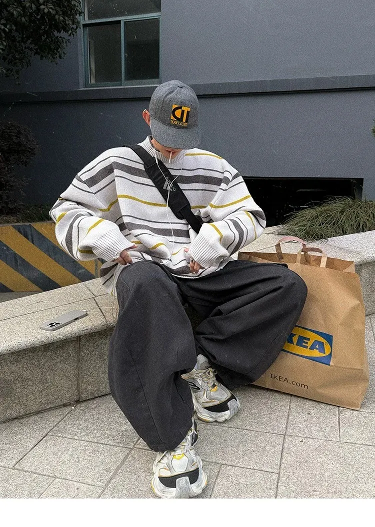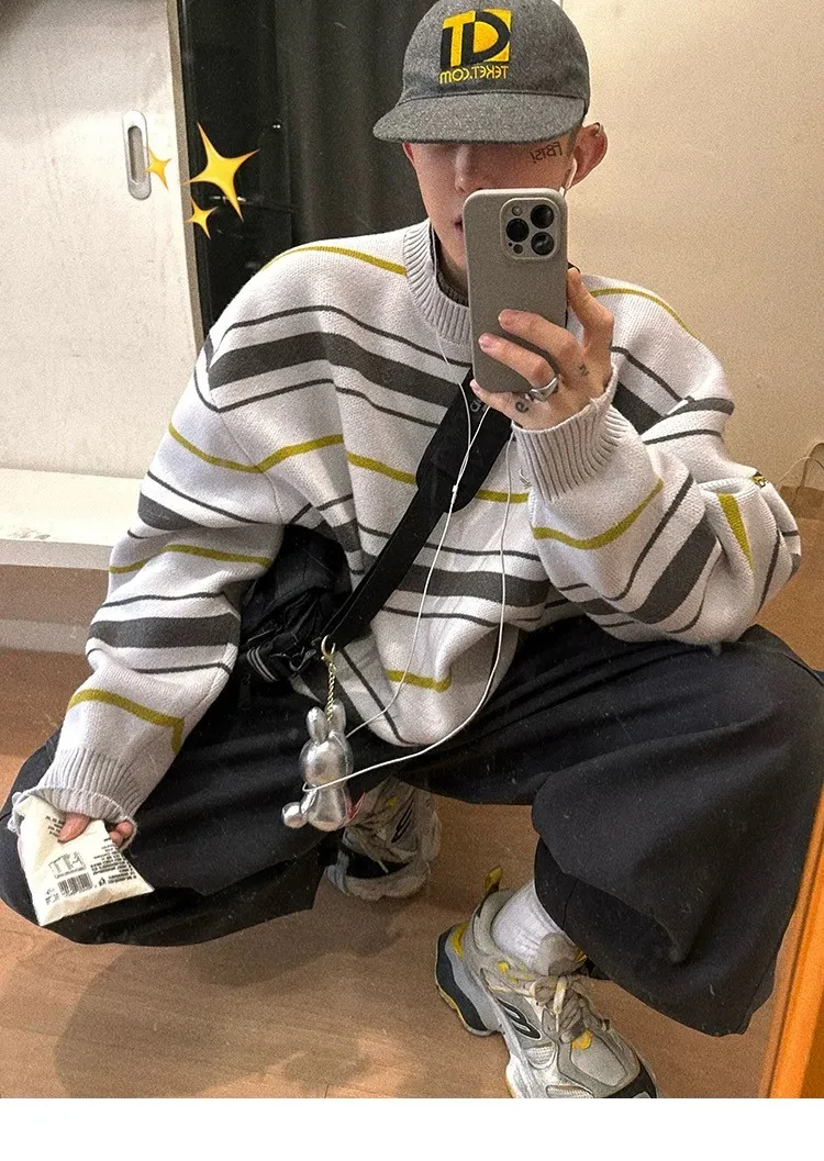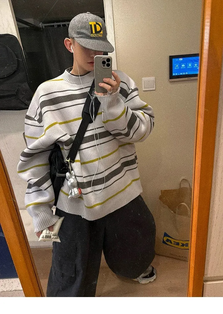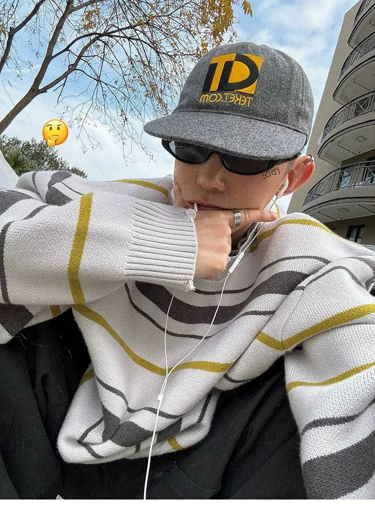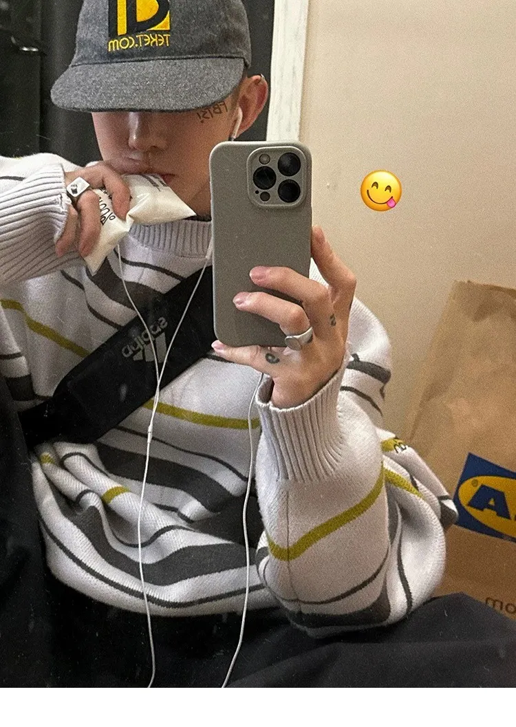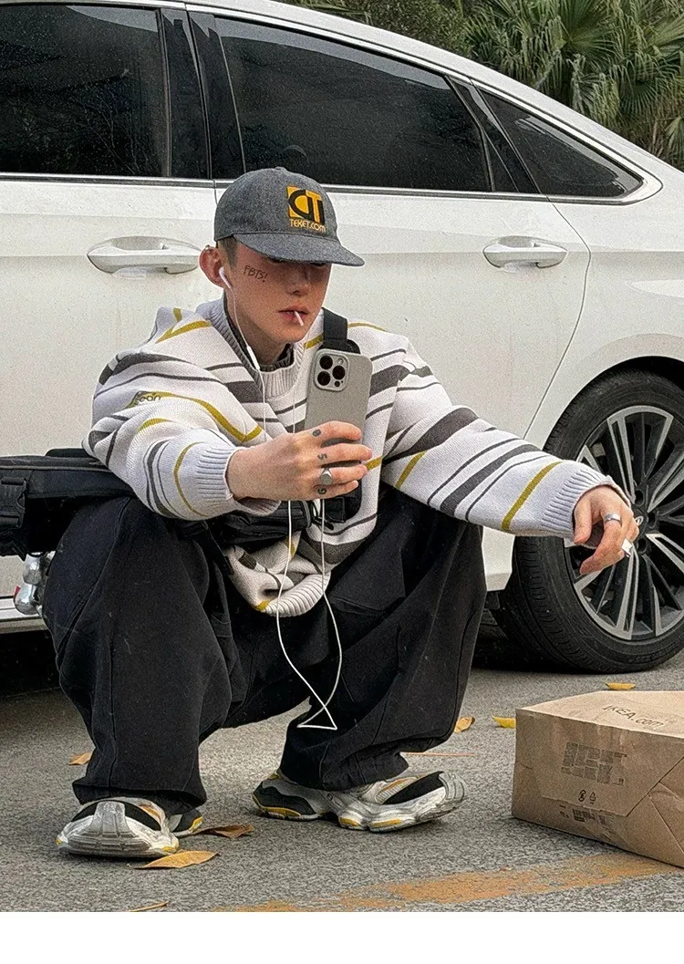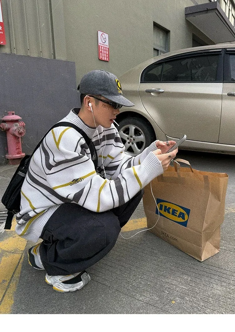 AUROCEAN 奶帥少年 破壞 撞色條紋 毛衣(奶白)