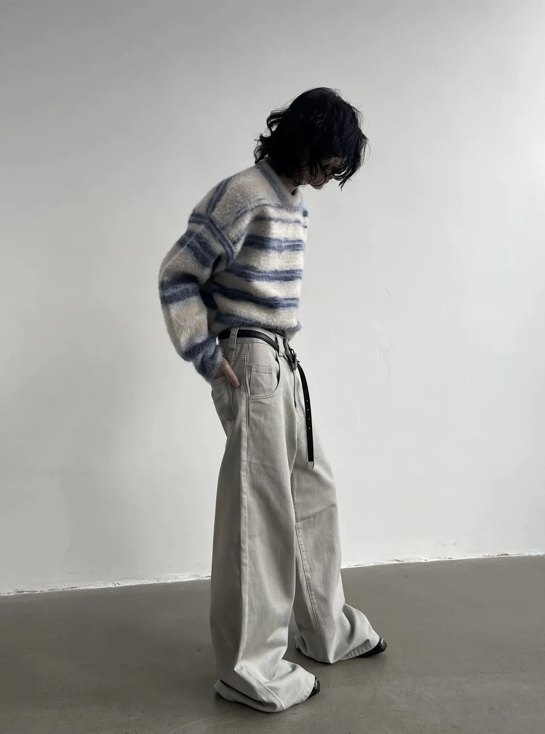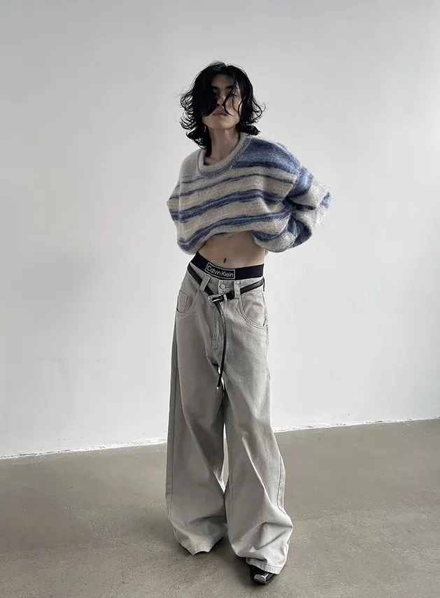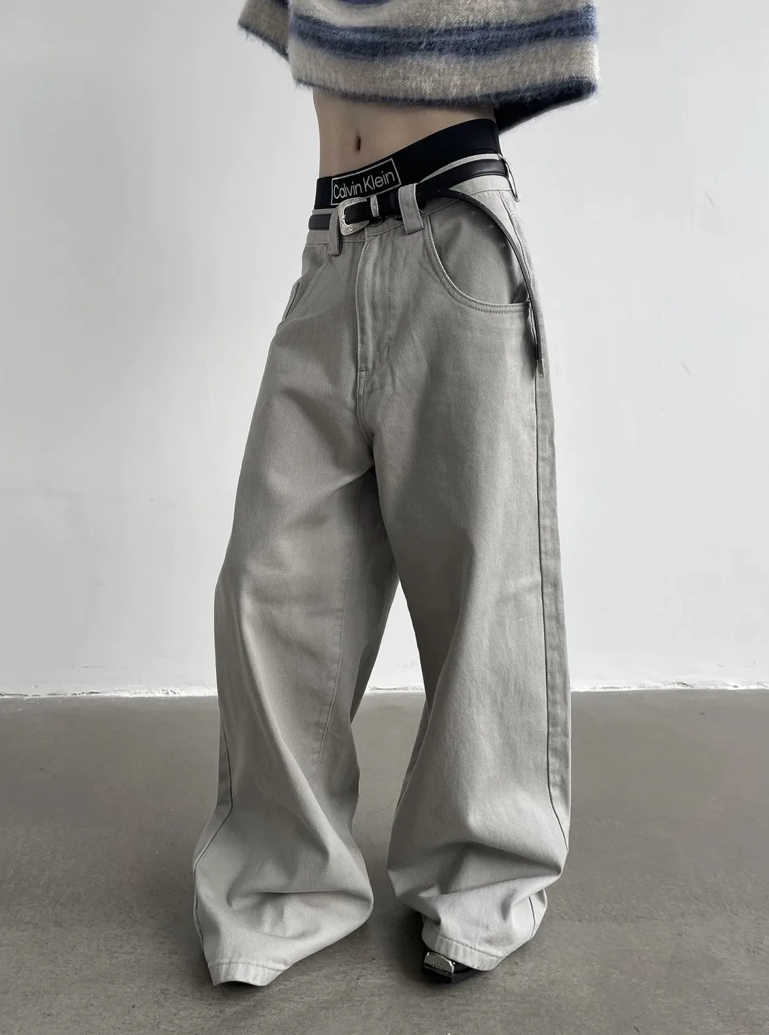 Fewest 純色 落地 闊腿 牛仔褲(灰色)