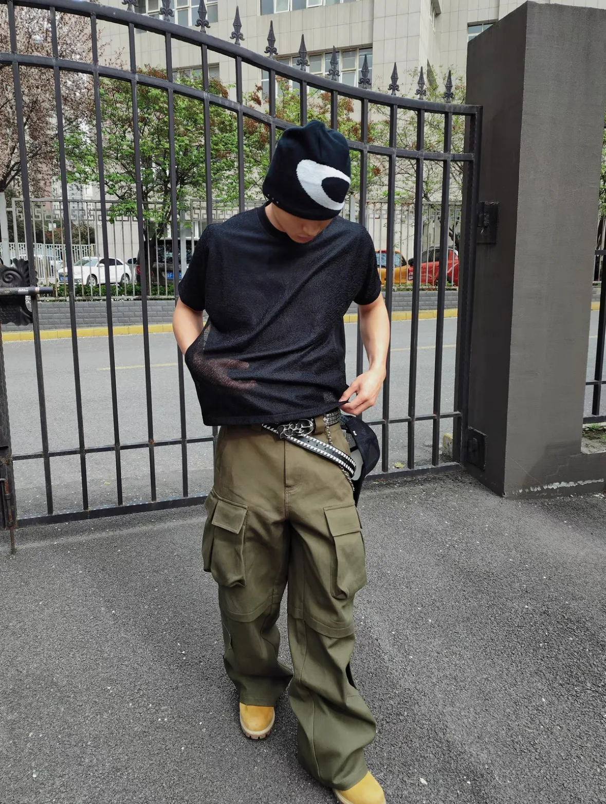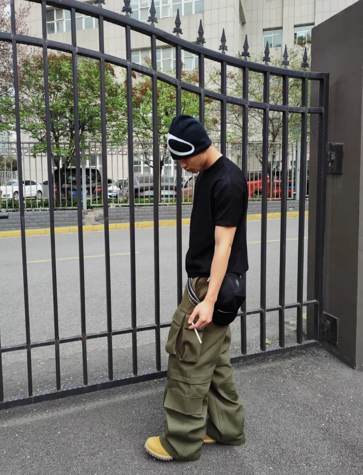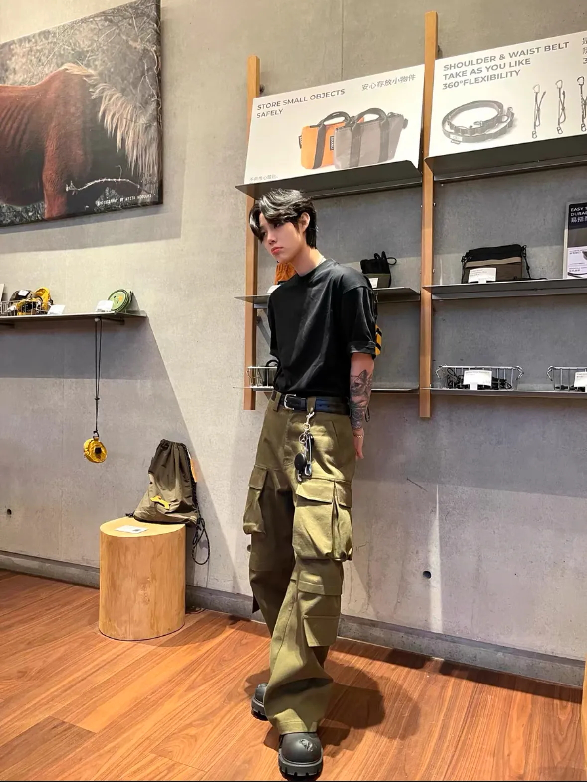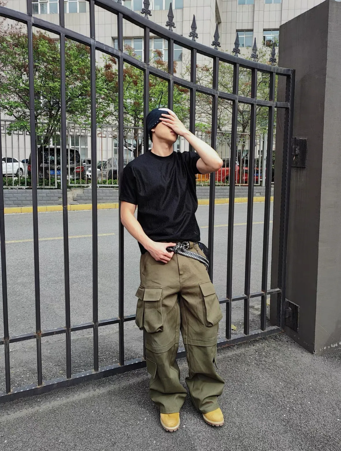 F4F 廓型立體 多口袋 寬鬆 工裝 傘兵褲 長褲(黑/綠)