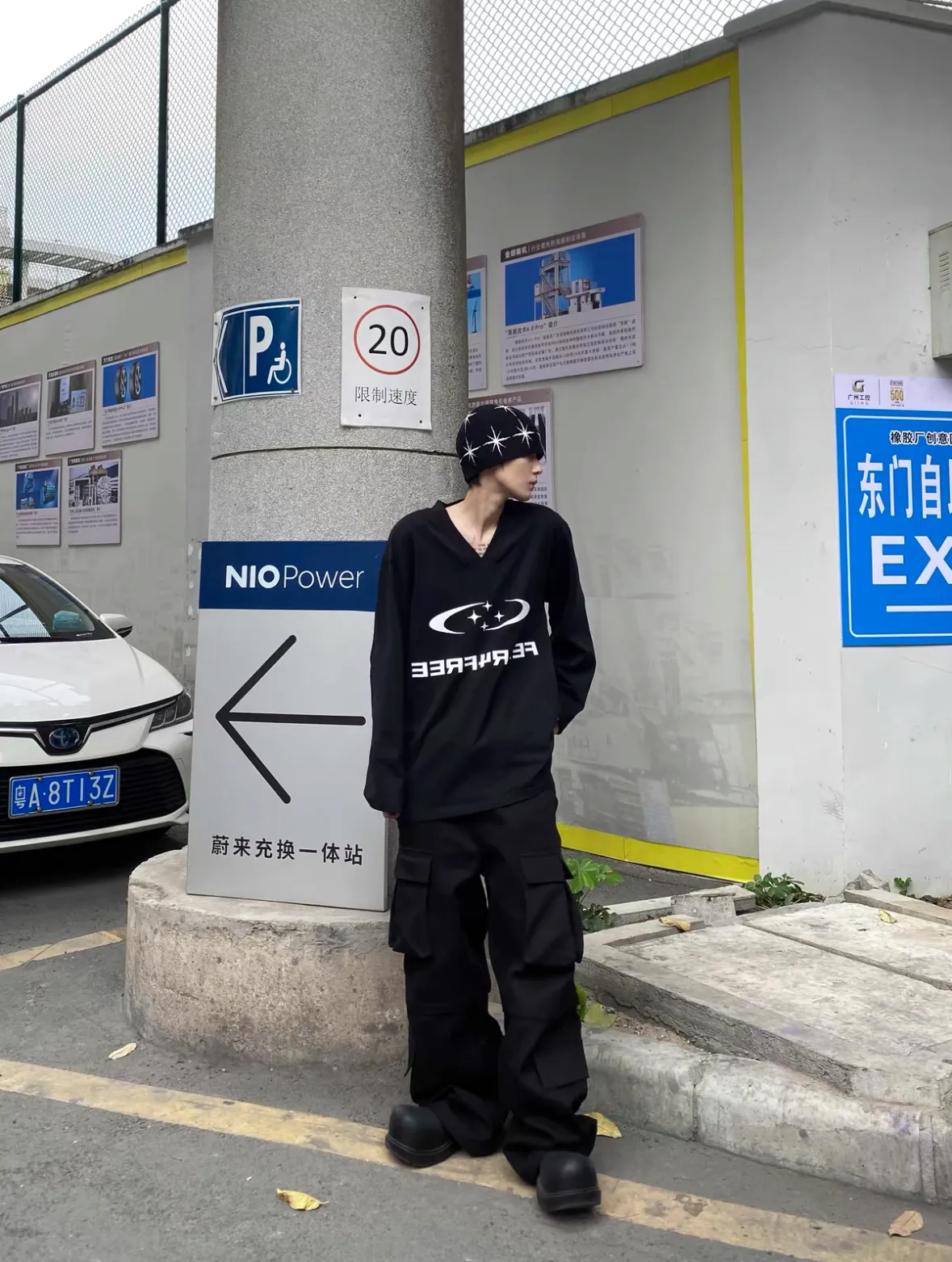 F4F 星芒 logo 廓形寬鬆 V領 bloke core 球衣 長袖(黑/白)