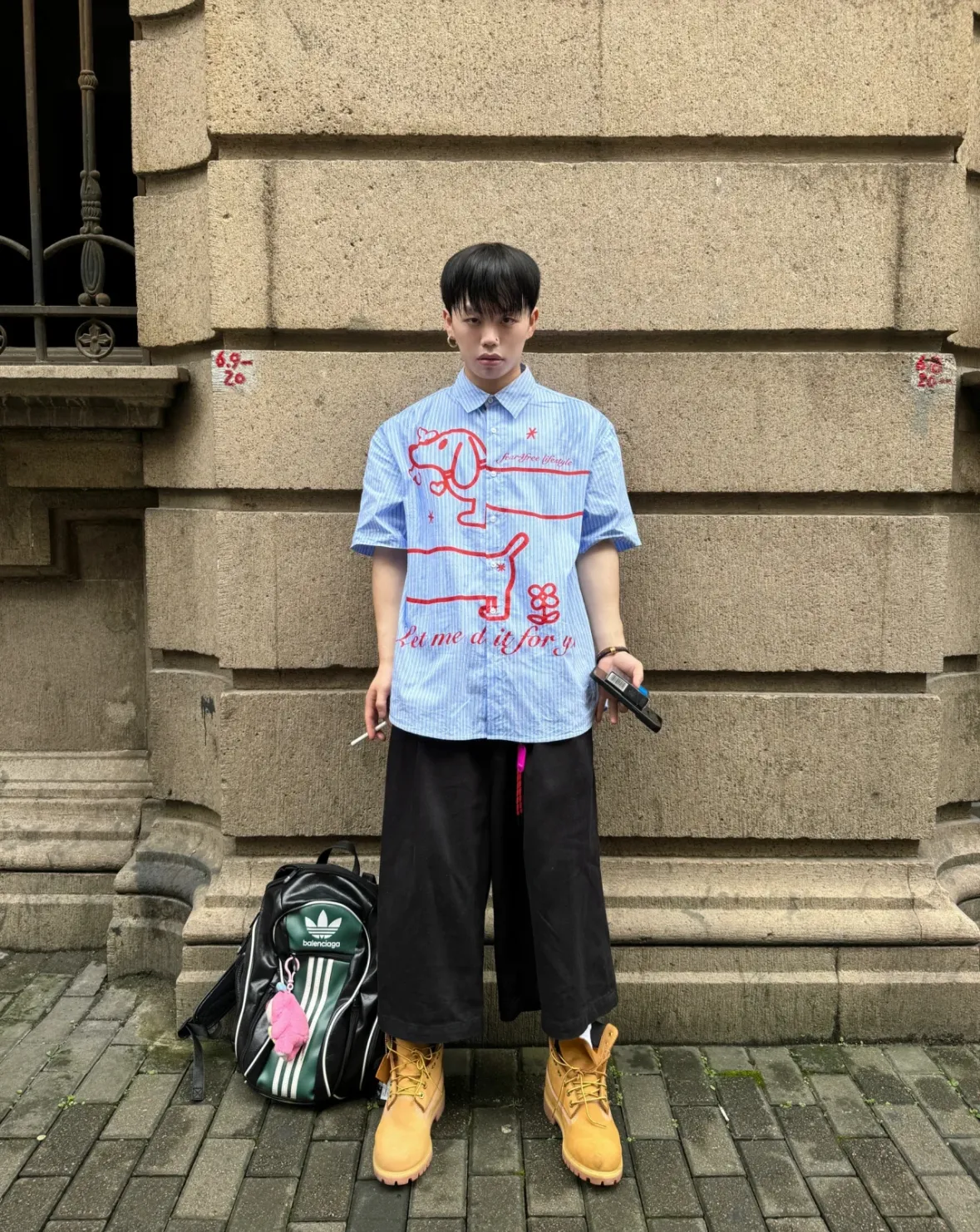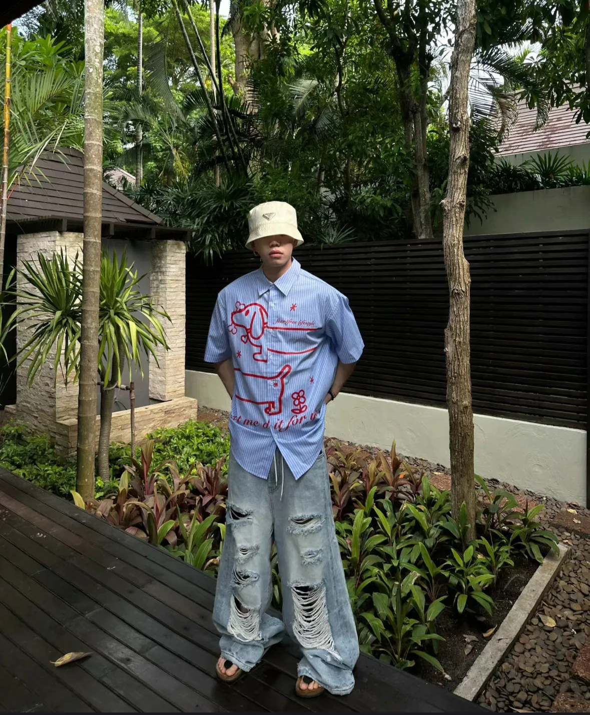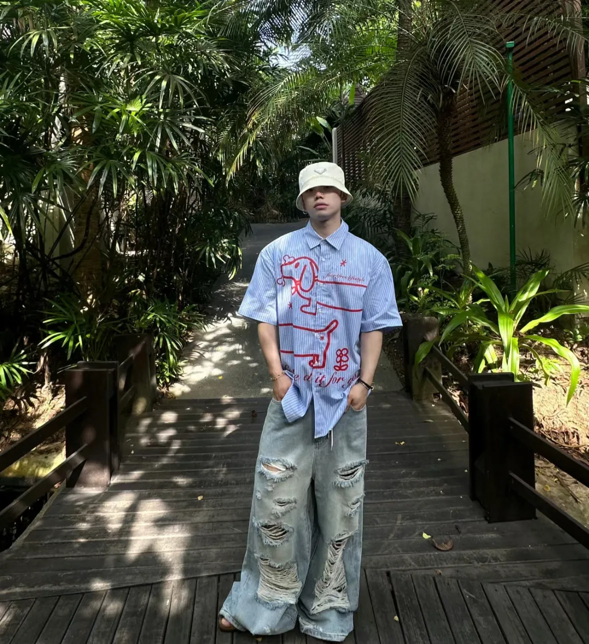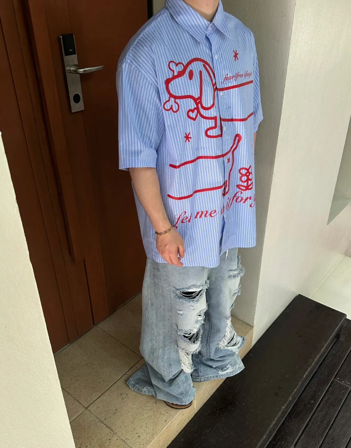 F4F 江草子 臘腸狗 條紋 魚骨 短袖 襯衫