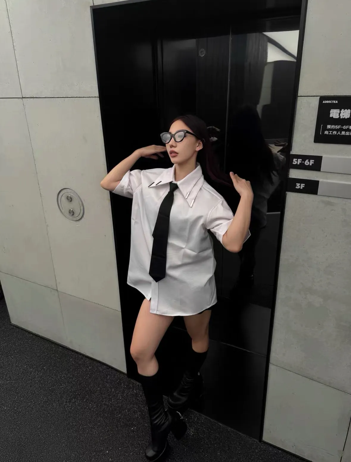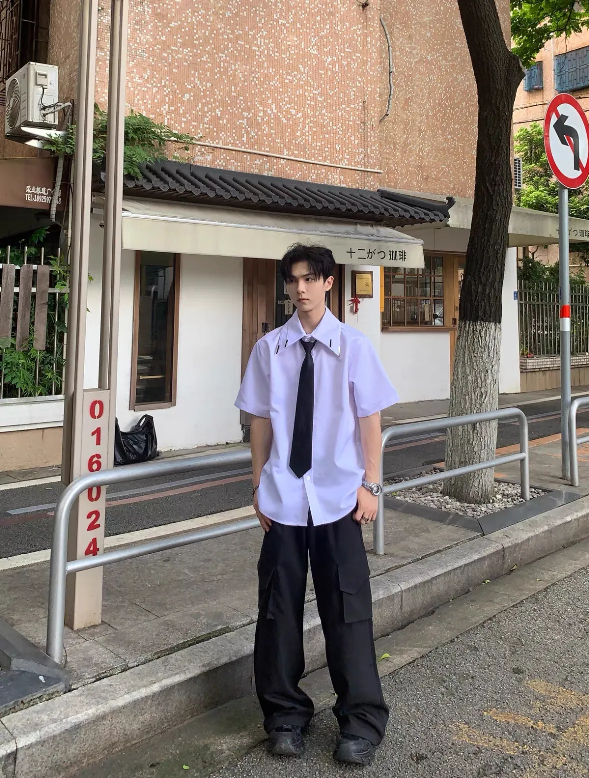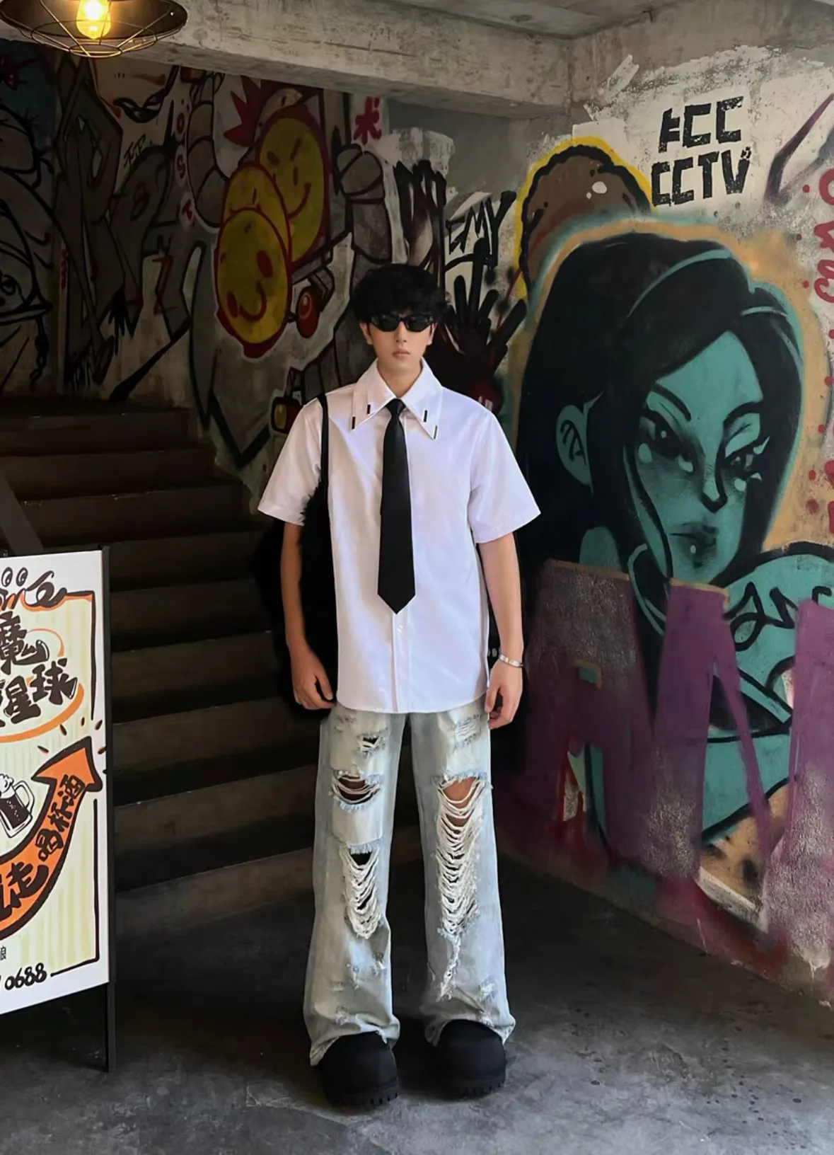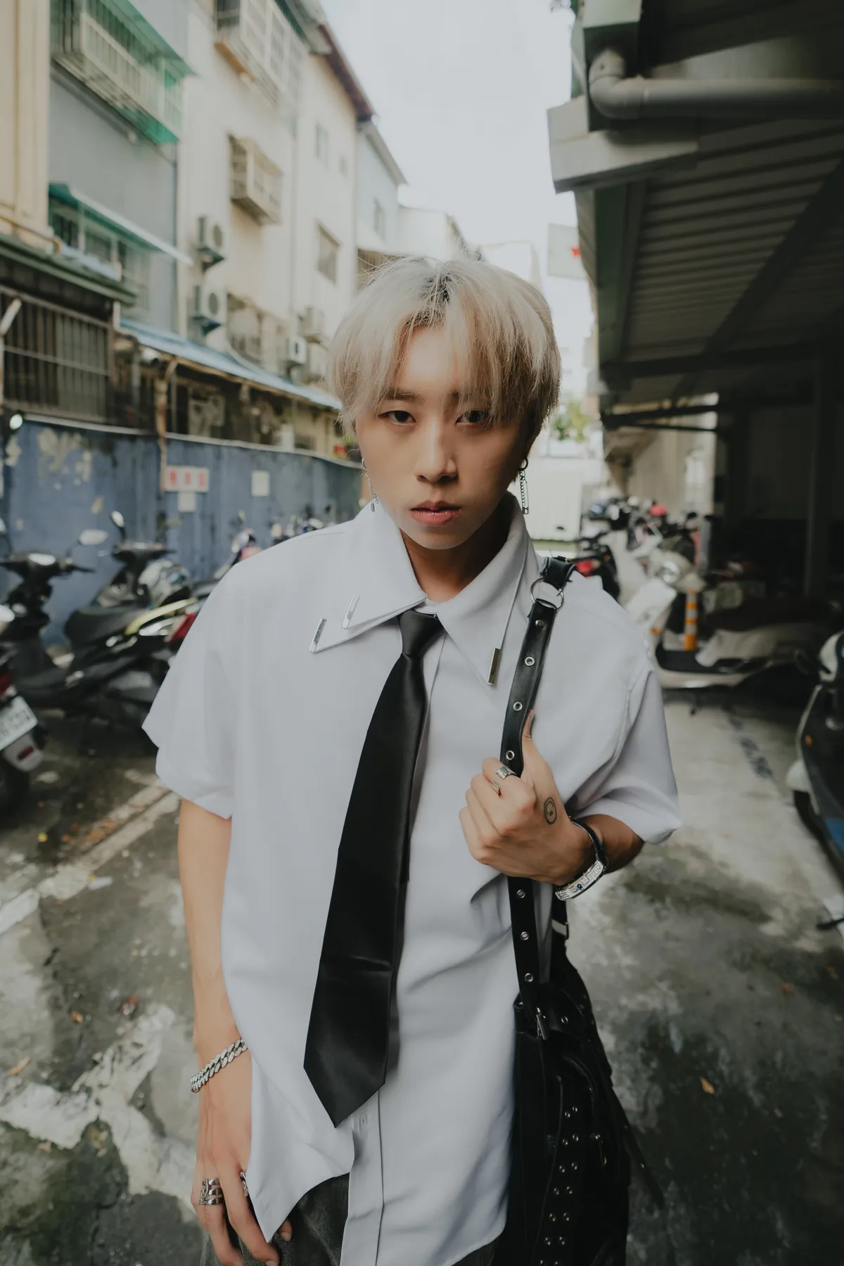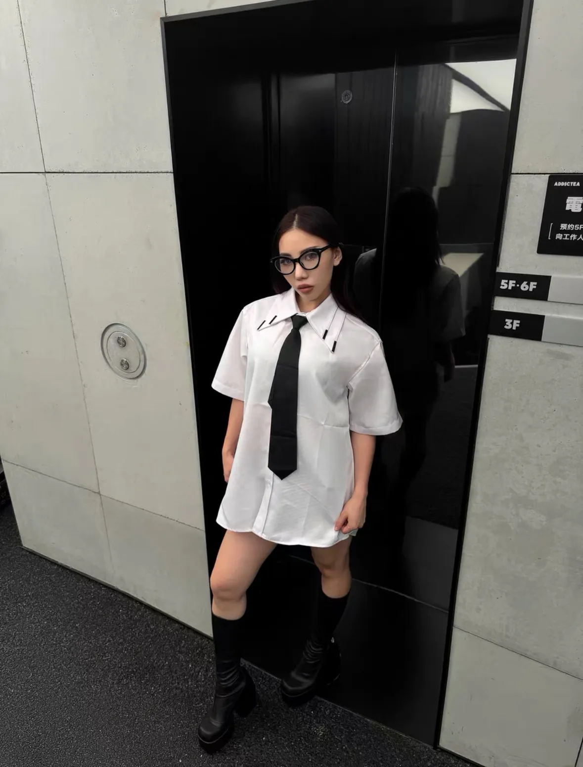 F4F 江草子 學院風 廓形 雙層領 抗皺 短袖襯衫(附贈領帶)