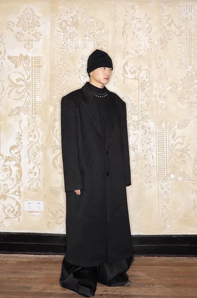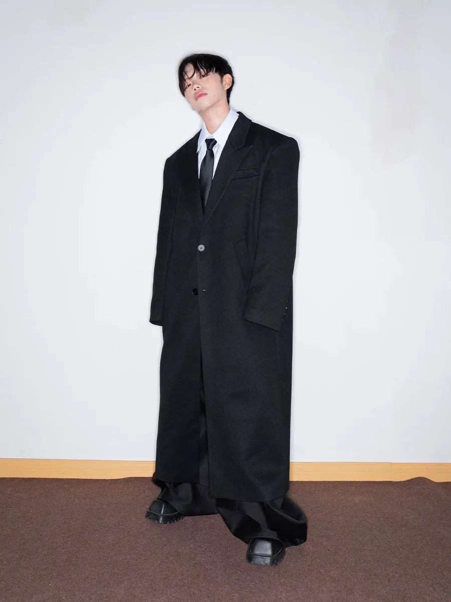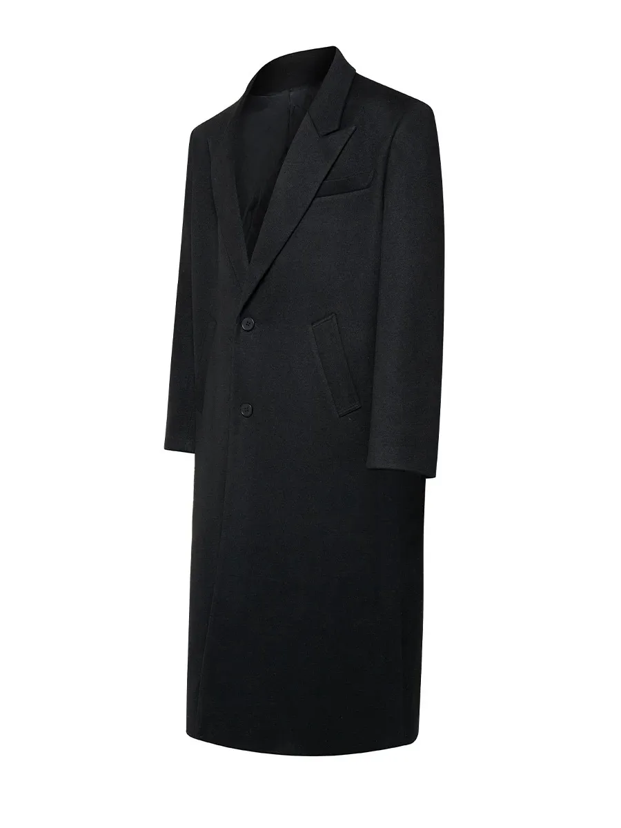 F4F 訂製 簡約寬鬆 毛呢 長版 大衣 外套(黑色)