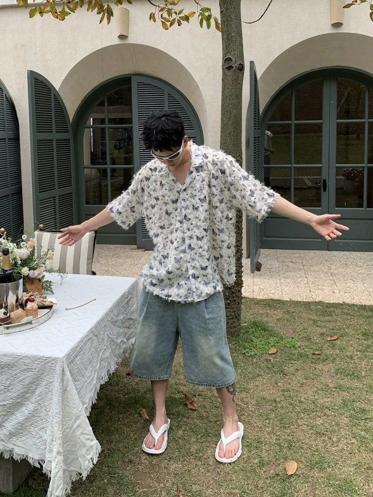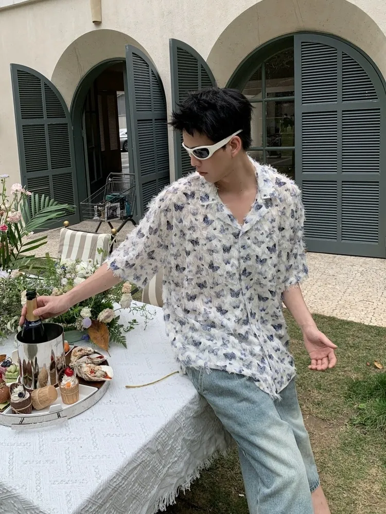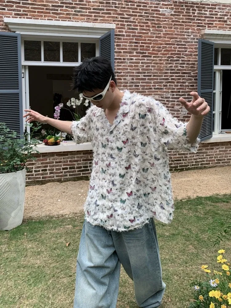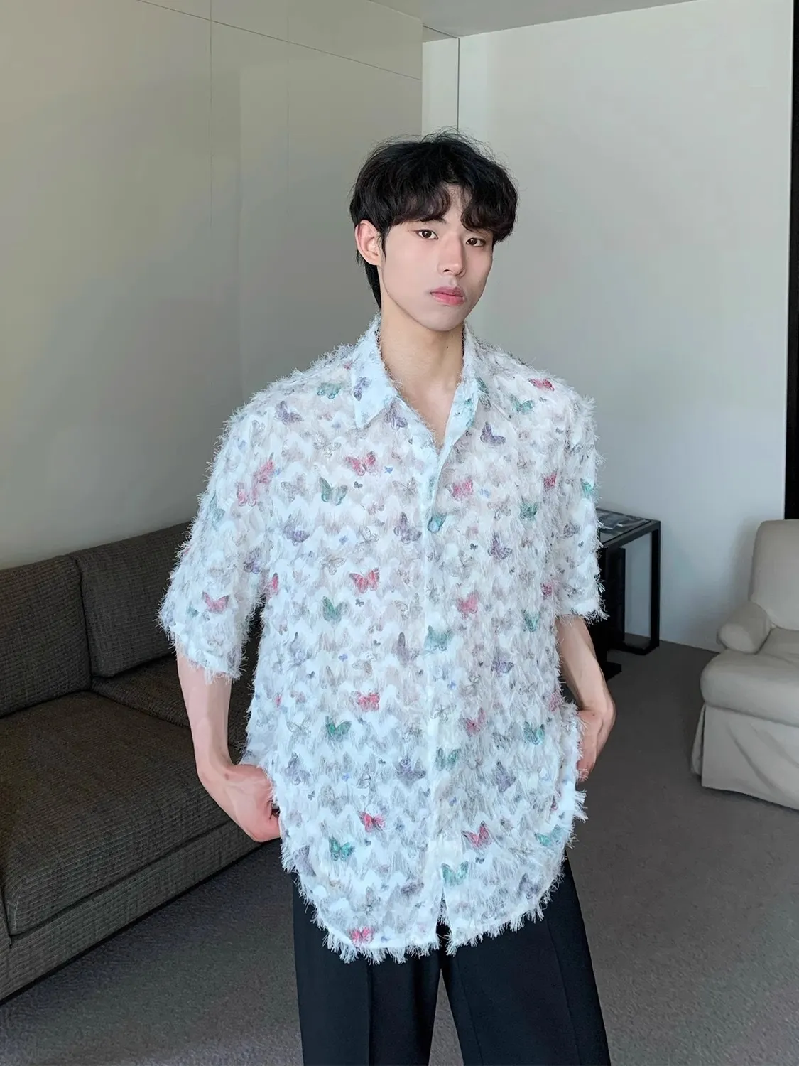 蝴蝶 流蘇設計 薄款 短袖 襯衫 (彩色/藍色)