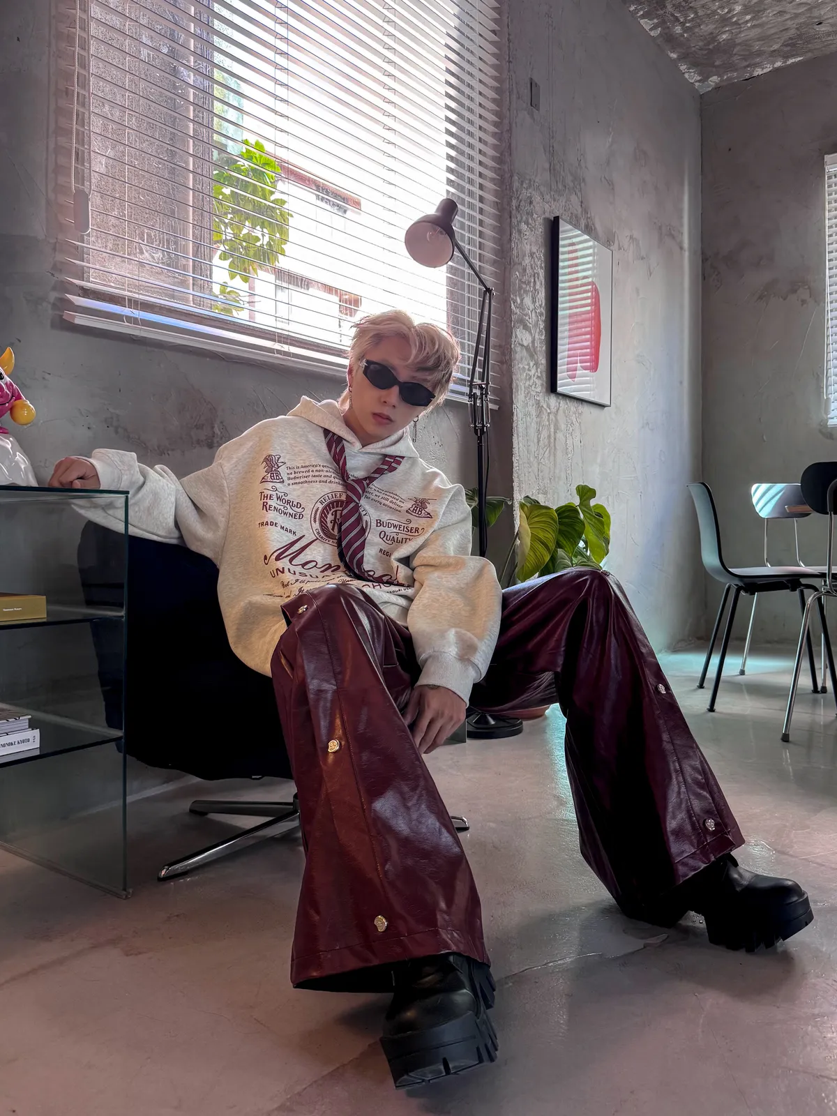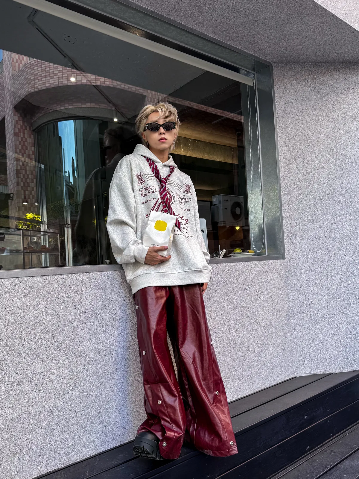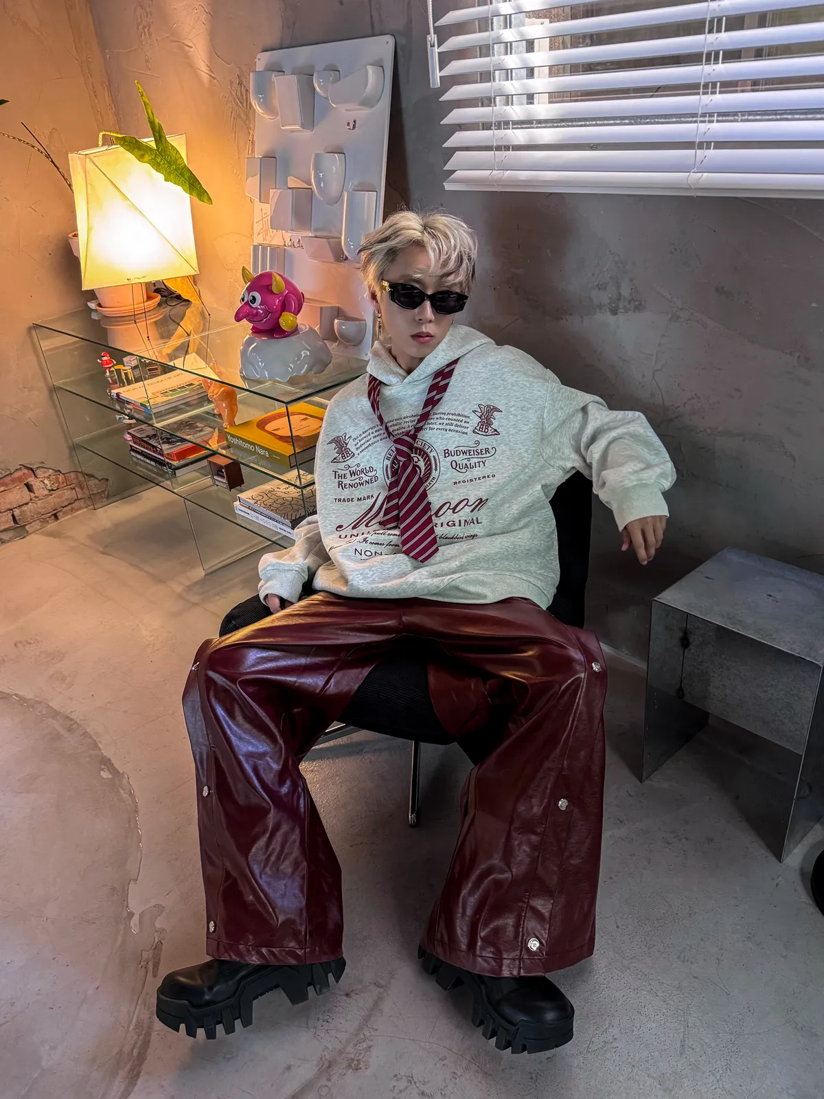 ARGUE 側開金屬扣 打褶 皮褲 長褲(酒紅)